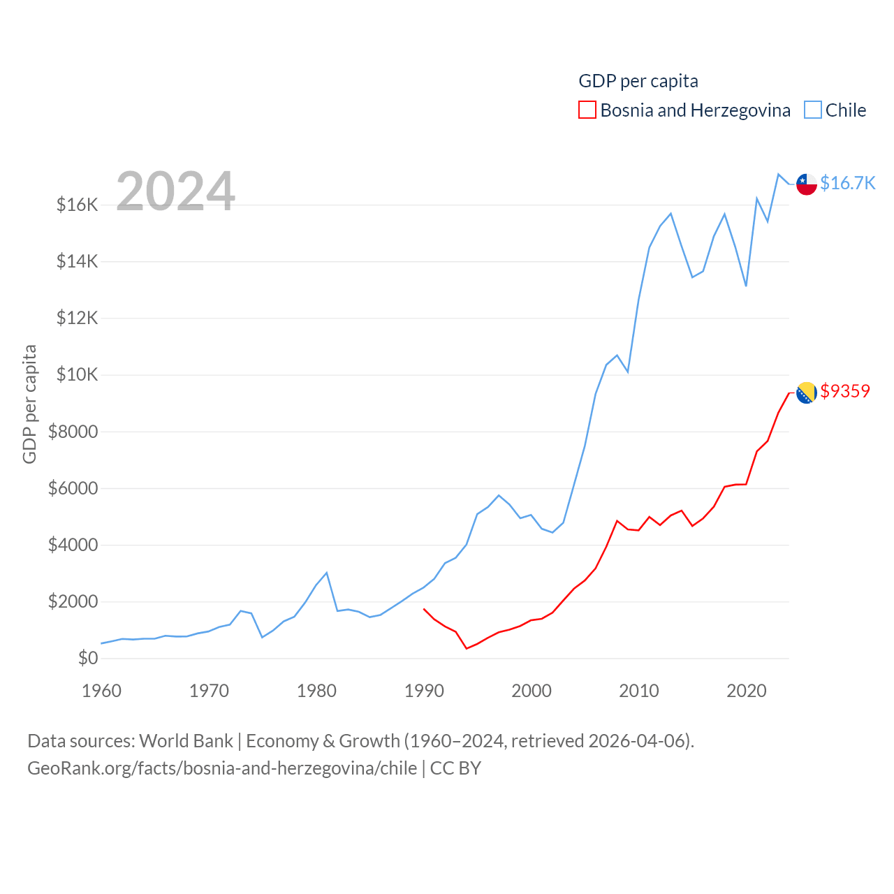 By GDP, Bosnia and Herzegovina ranks 111/197 ($29.6B) and Chile ranks 45/197 ($330B). By GDP per capita, Bosnia and Herzegovina ranks 87/197 ($9,359), while Chile ranks 65/197 ($16,710).