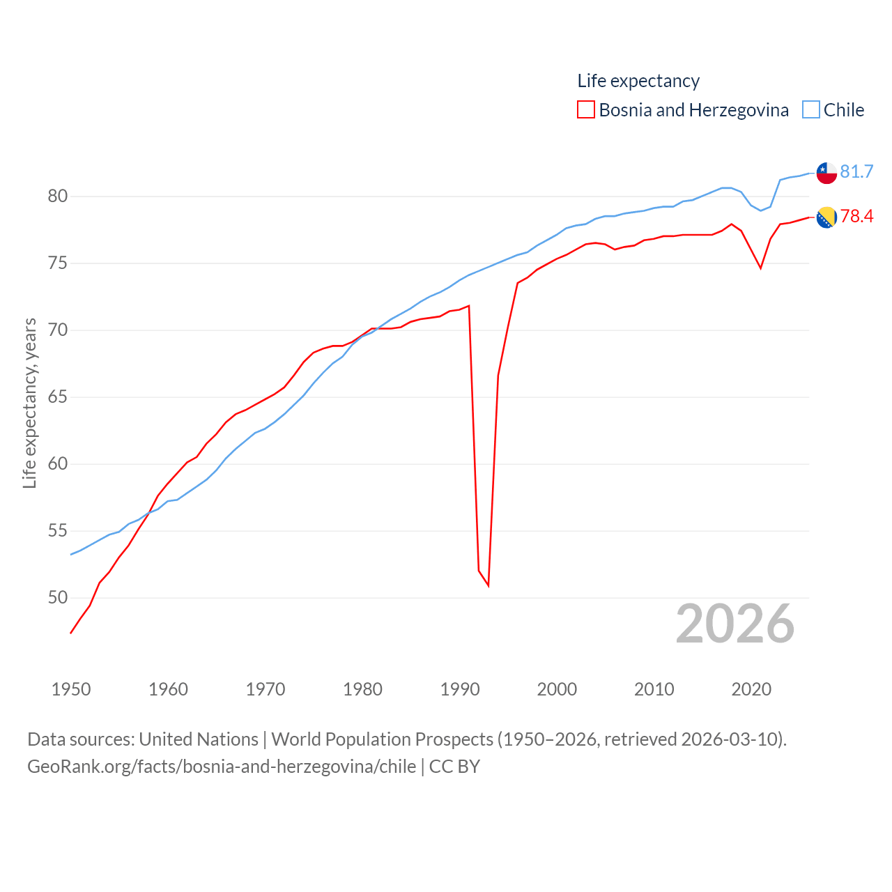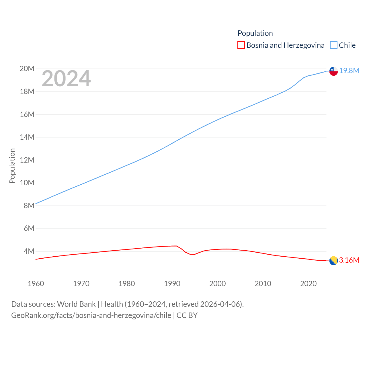 Bosnia and Herzegovina has a population of 3.16M (ranked 134/197), compared with 19.8M in Chile (ranked 66/197). Bosnia and Herzegovina's land area is 19,768 sq mi versus 286,809 sq mi for Chile (ranked 125th vs. 38th).
