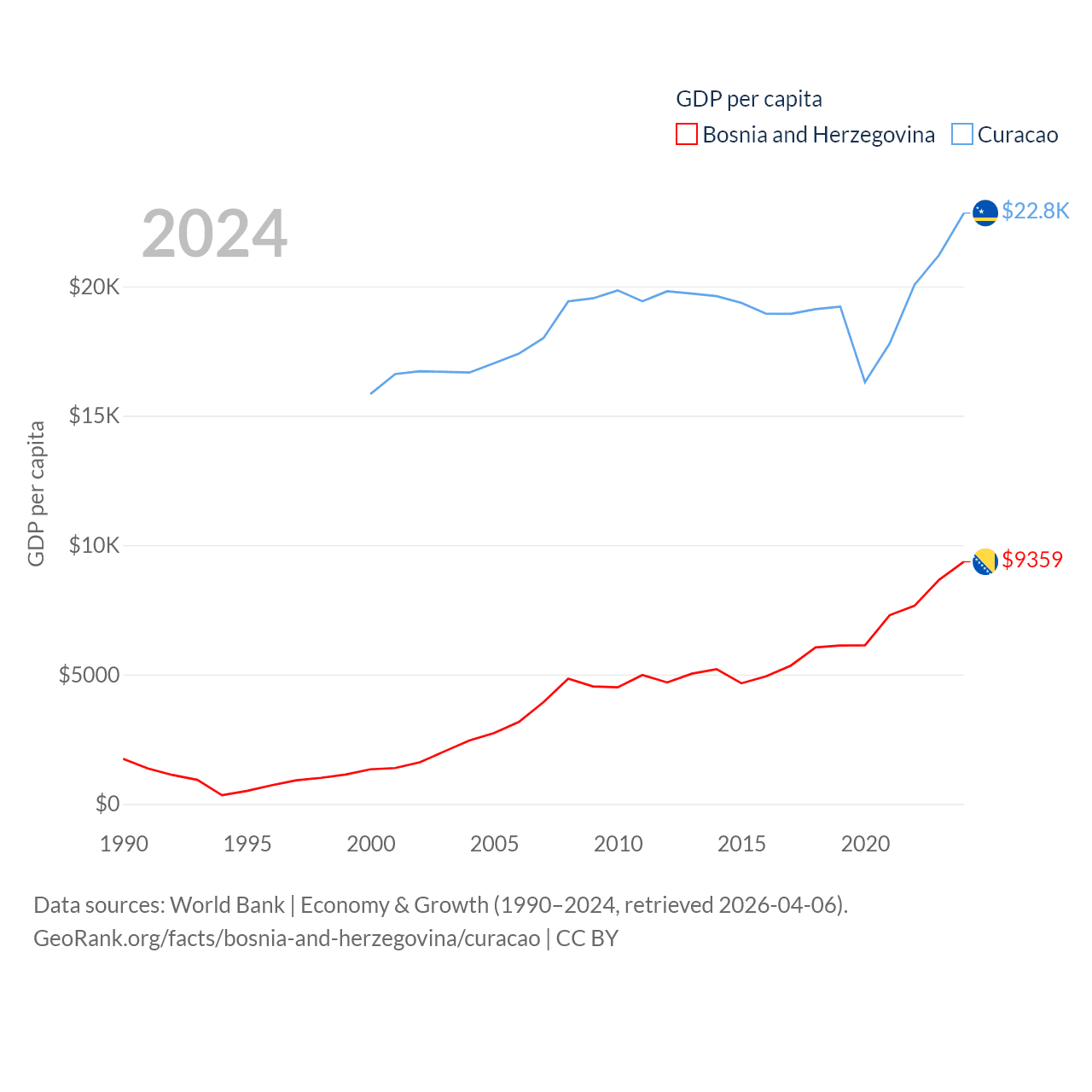 By GDP, Bosnia and Herzegovina ranks 111/197 ($29.6B) and Curacao ranks 167/197 ($3.56B). By GDP per capita, Bosnia and Herzegovina ranks 87/197 ($9,359), while Curacao ranks 56/197 ($22,833).