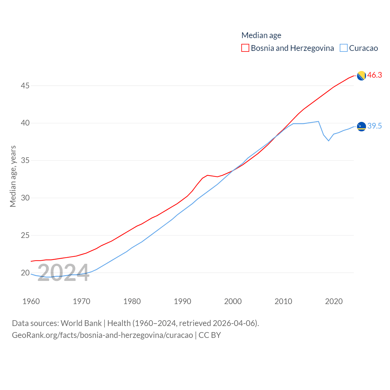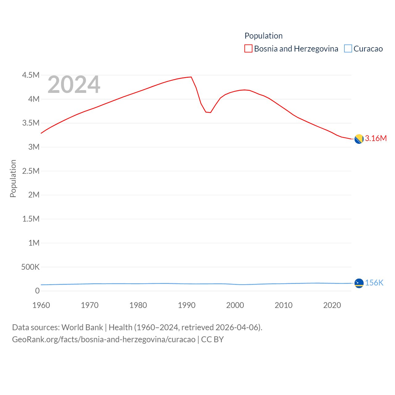 Bosnia and Herzegovina has a population of 3.16M (ranked 134/197), compared with 156K in Curacao (ranked 179/197). Bosnia and Herzegovina's land area is 19,768 sq mi versus 171.4 sq mi for Curacao (ranked 125th vs. 182nd).