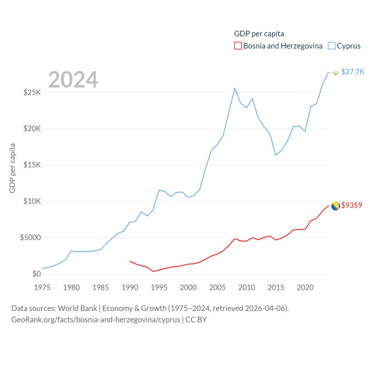 By GDP, Bosnia and Herzegovina ranks 111/197 ($29.6B) and Cyprus ranks 103/197 ($37.6B). By GDP per capita, Bosnia and Herzegovina ranks 87/197 ($9,359), while Cyprus ranks 45/197 ($27,707).