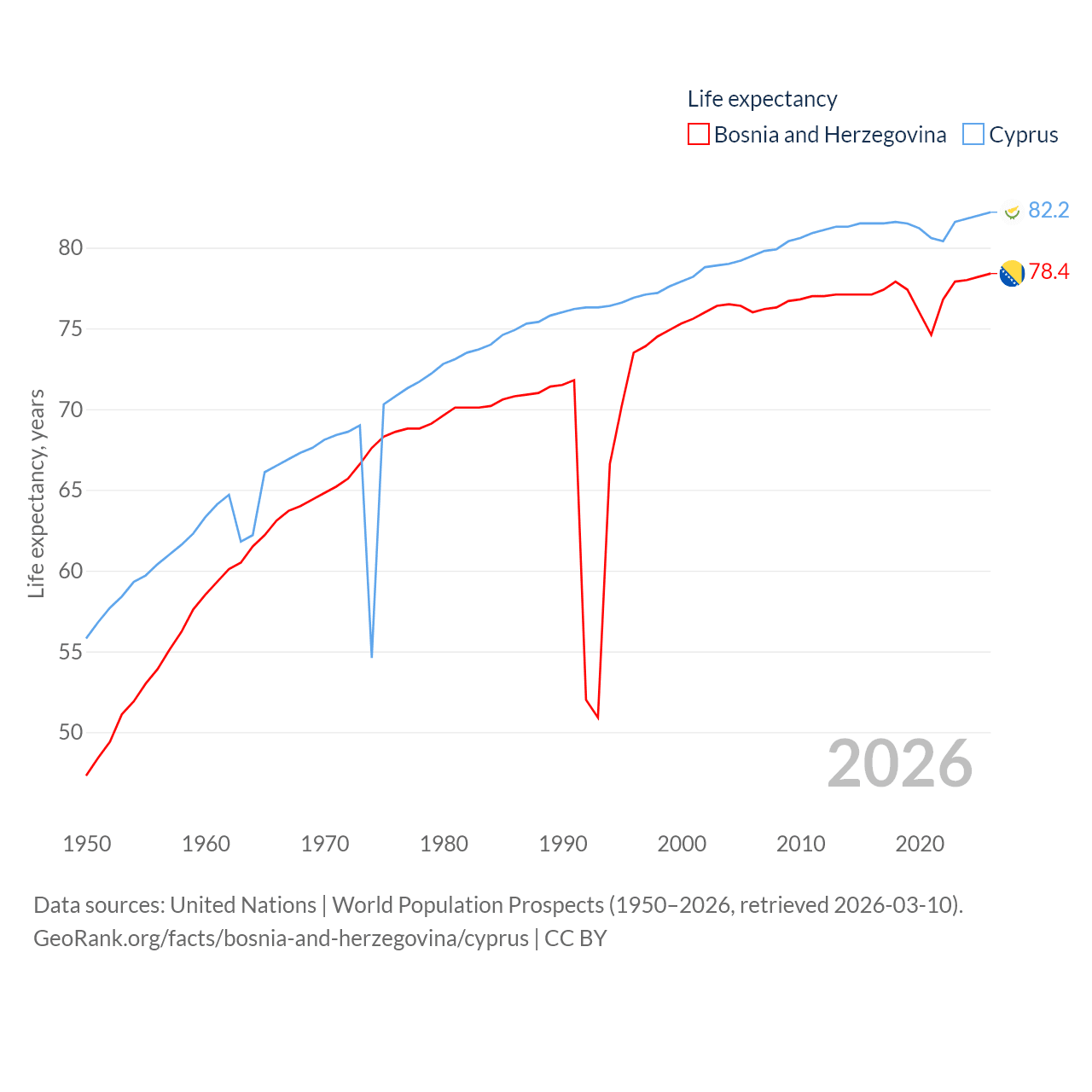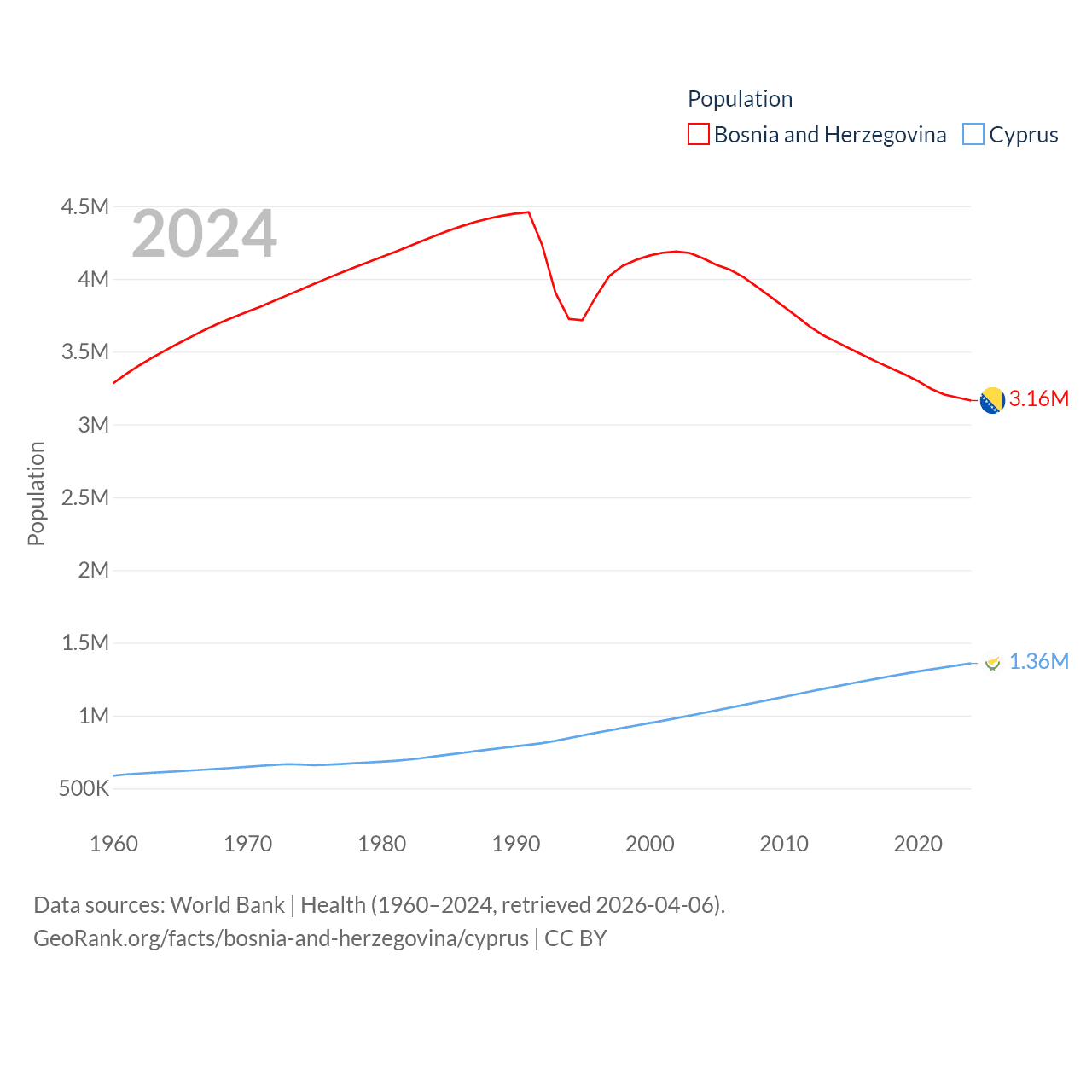 Bosnia and Herzegovina has a population of 3.16M (ranked 134/197), compared with 1.36M in Cyprus (ranked 155/197). Bosnia and Herzegovina's land area is 19,768 sq mi versus 3,568 sq mi for Cyprus (ranked 125th vs. 163rd).