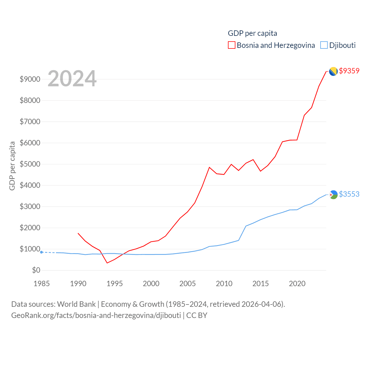 By GDP, Bosnia and Herzegovina ranks 111/197 ($29.6B) and Djibouti ranks 165/197 ($4.15B). By GDP per capita, Bosnia and Herzegovina ranks 87/197 ($9,359), while Djibouti ranks 133/197 ($3,553).