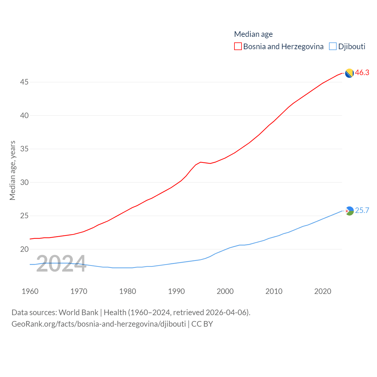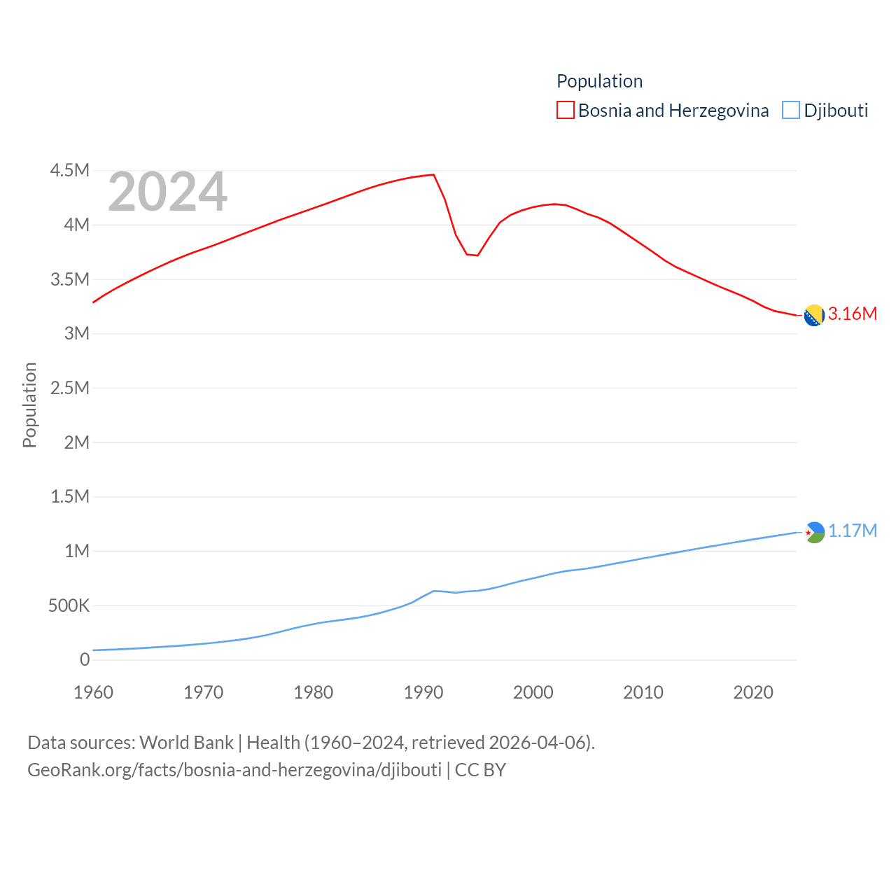 Bosnia and Herzegovina has a population of 3.16M (ranked 134/197), compared with 1.17M in Djibouti (ranked 158/197). Bosnia and Herzegovina's land area is 19,768 sq mi versus 8,950 sq mi for Djibouti (ranked 125th vs. 147th).