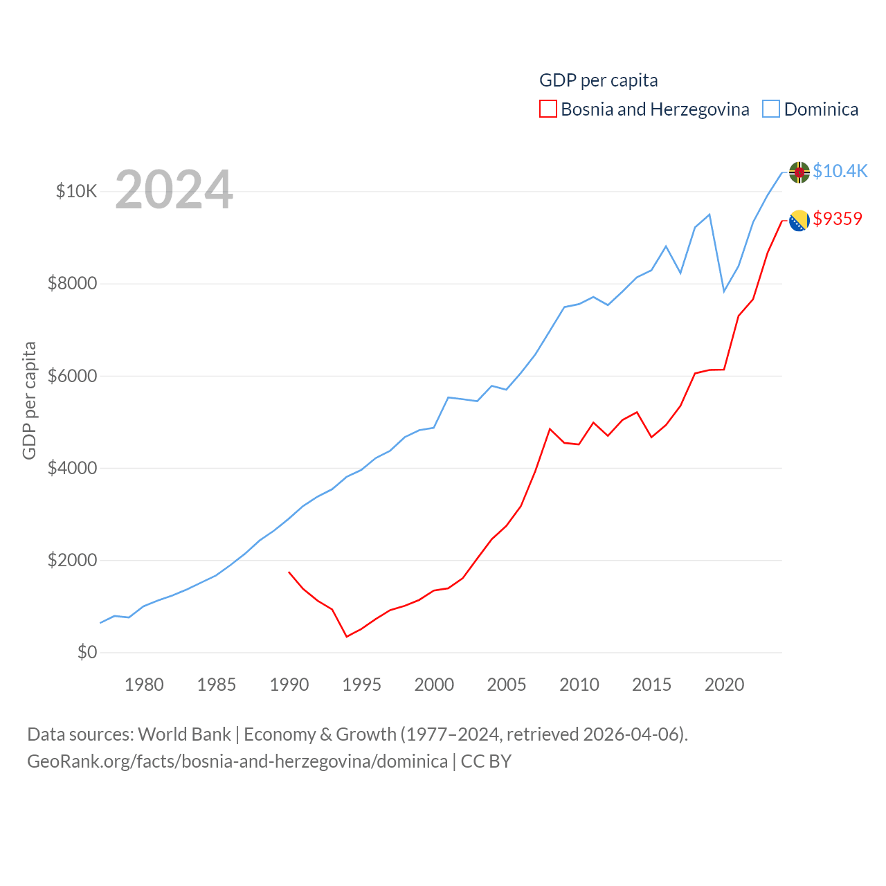 By GDP, Bosnia and Herzegovina ranks 111/197 ($29.6B) and Dominica ranks 190/197 ($689M). By GDP per capita, Bosnia and Herzegovina ranks 87/197 ($9,359), while Dominica ranks 84/197 ($10,405).