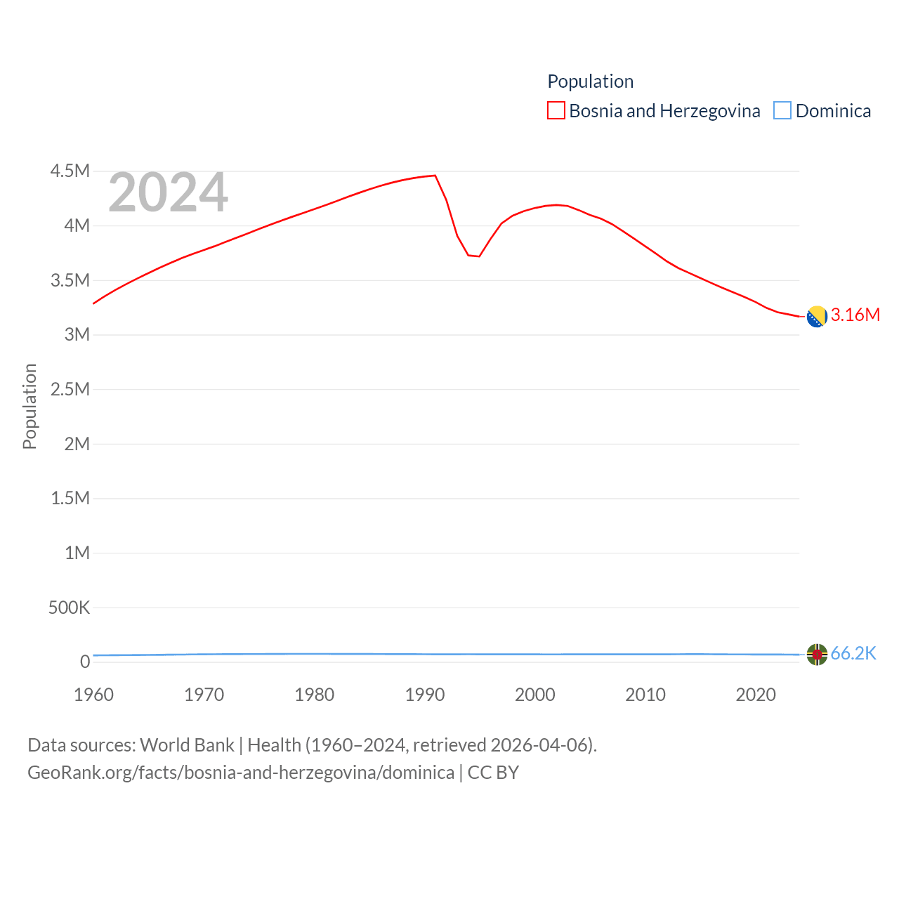Bosnia and Herzegovina has a population of 3.16M (ranked 134/197), compared with 66.2K in Dominica (ranked 188/197). Bosnia and Herzegovina's land area is 19,768 sq mi versus 289.6 sq mi for Dominica (ranked 125th vs. 175th).