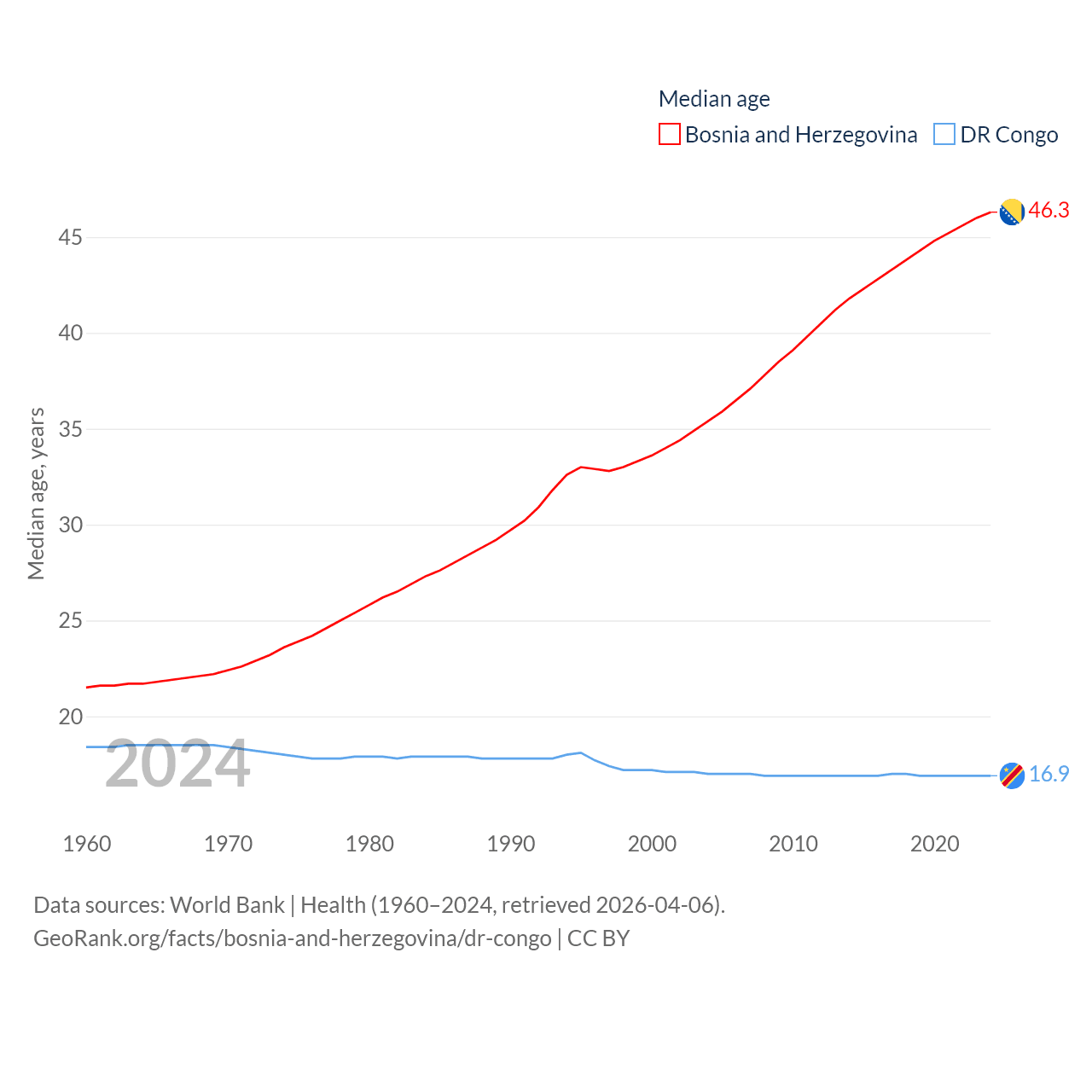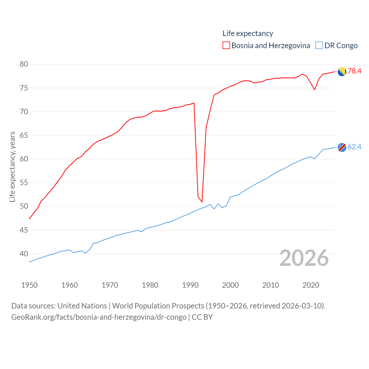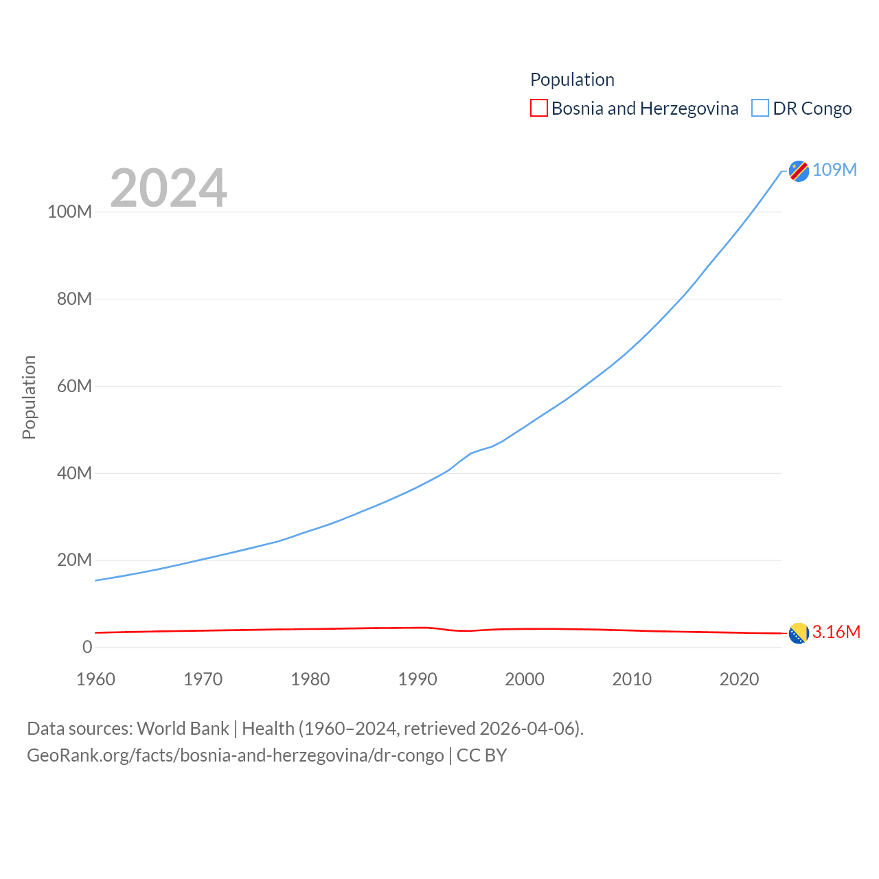 Bosnia and Herzegovina has a population of 3.16M (ranked 134/197), compared with 109M in The DR Congo (ranked 15/197). Bosnia and Herzegovina's land area is 19,768 sq mi versus 875,313 sq mi for The DR Congo (ranked 125th vs. 11th).