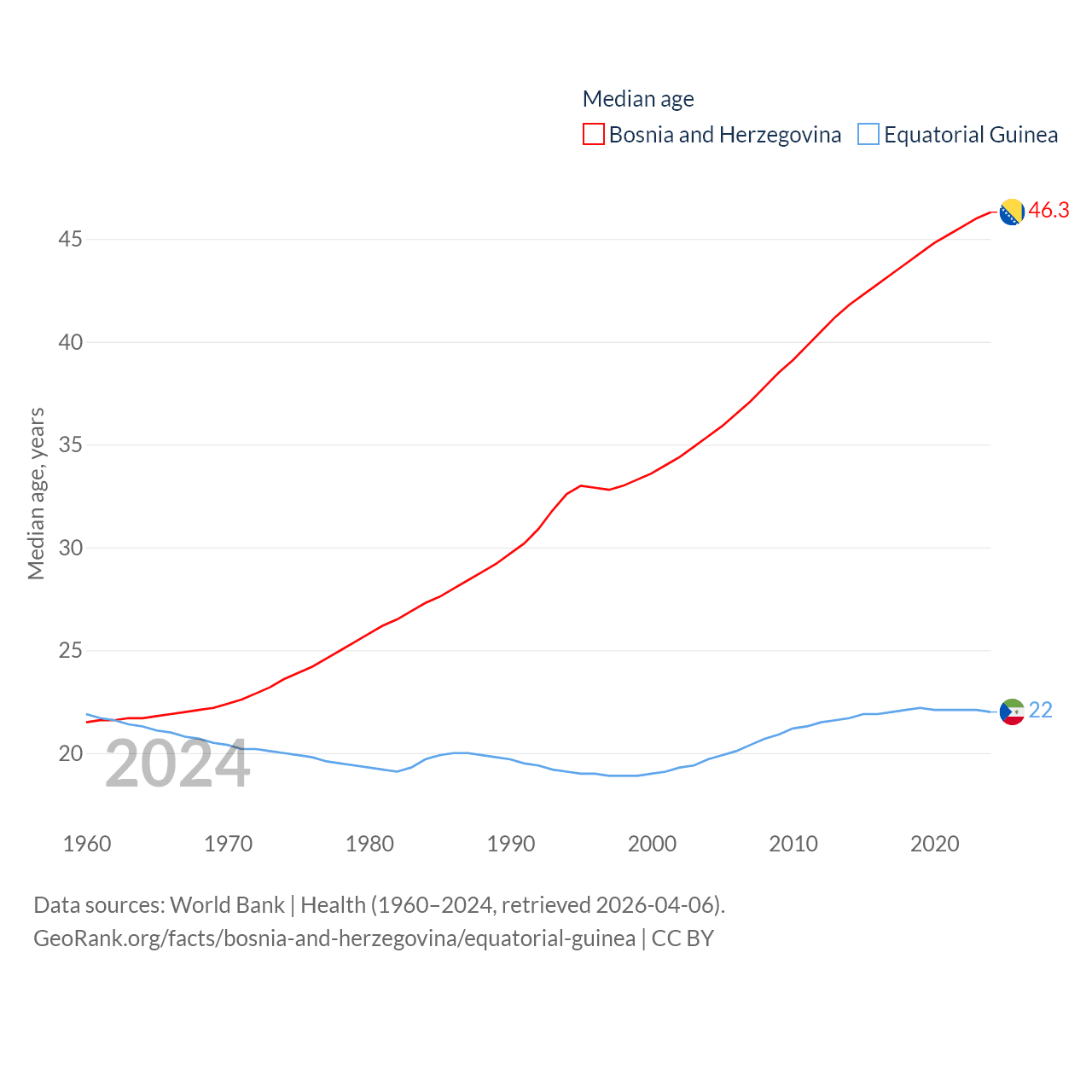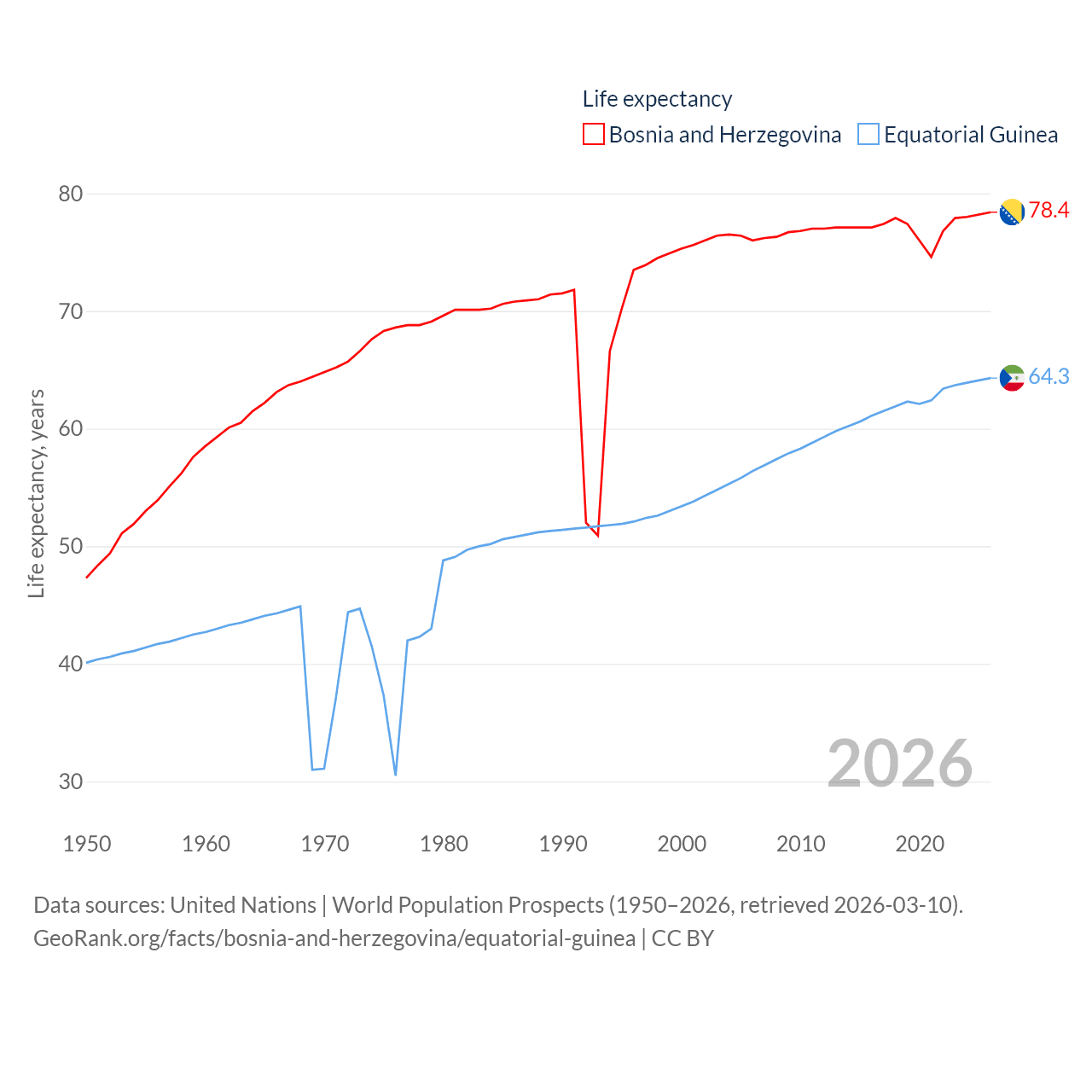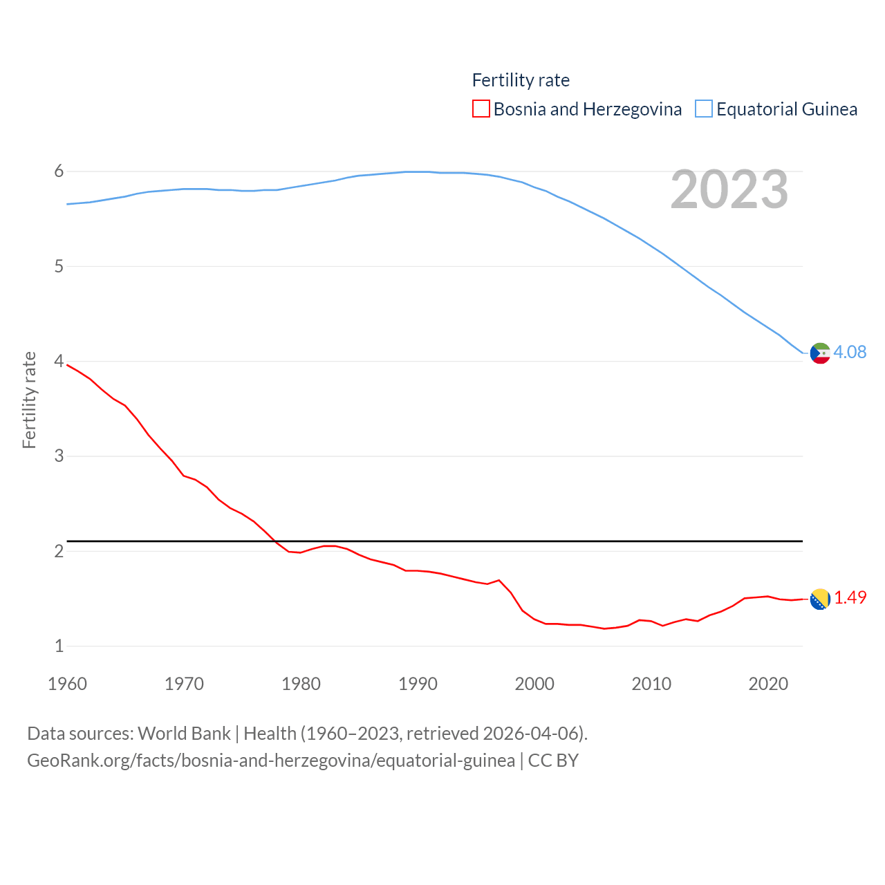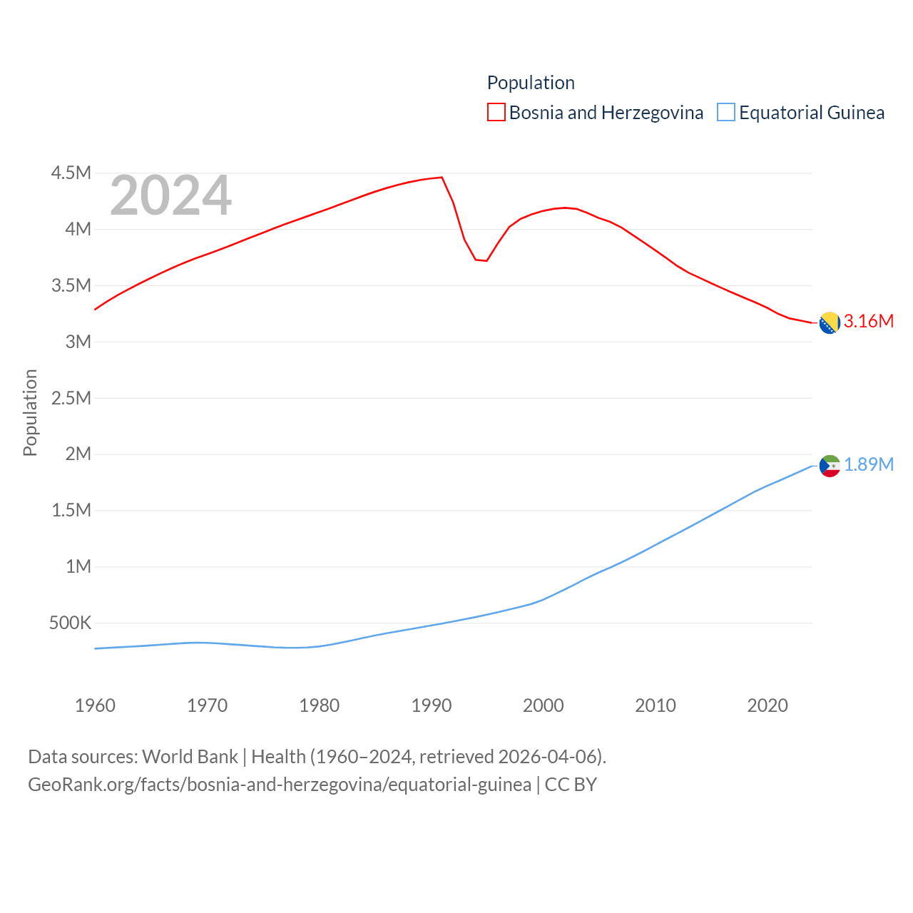 Bosnia and Herzegovina has a population of 3.16M (ranked 134/197), compared with 1.89M in Equatorial Guinea (ranked 148/197). Bosnia and Herzegovina's land area is 19,768 sq mi versus 10,830 sq mi for Equatorial Guinea (ranked 125th vs. 140th).