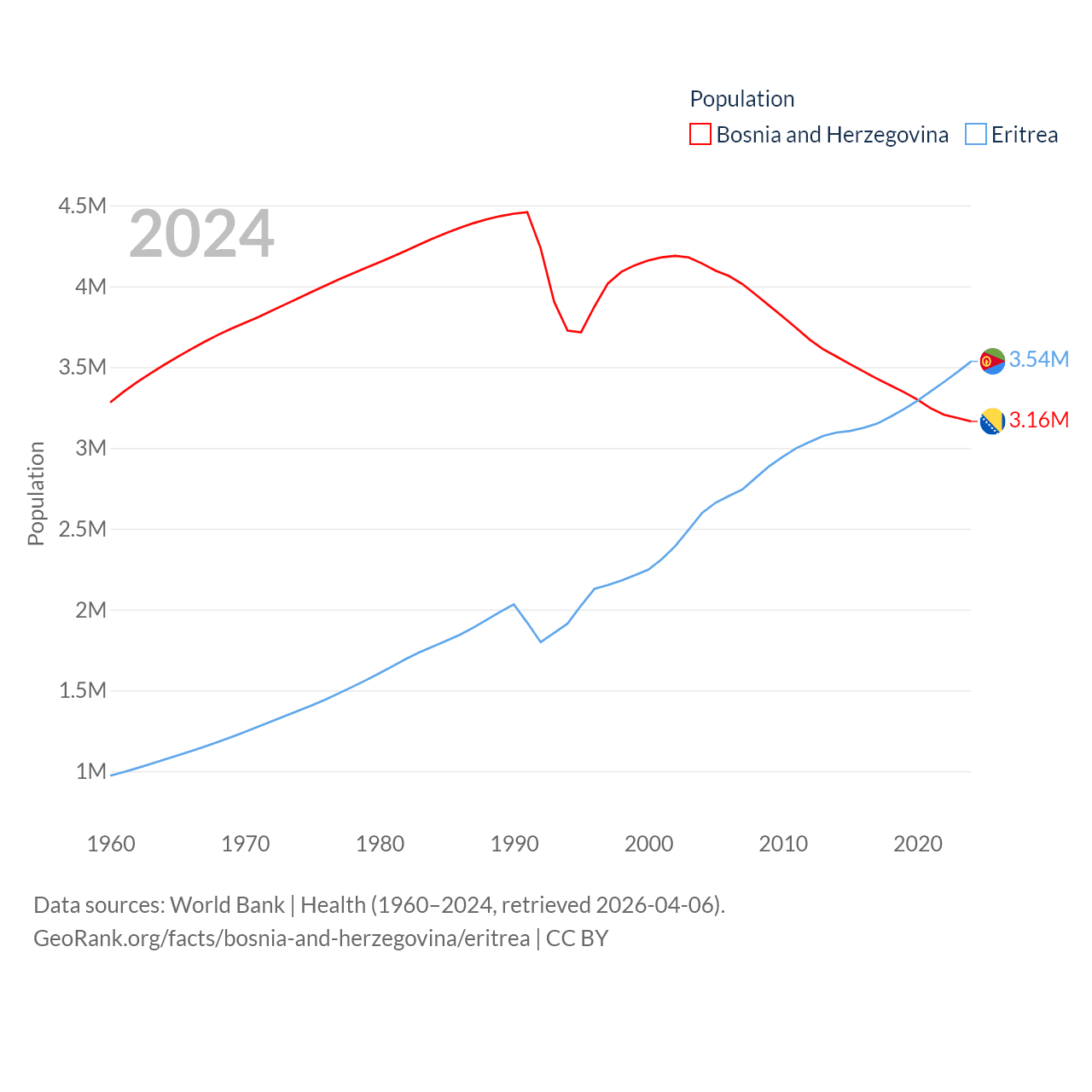 Bosnia and Herzegovina has a population of 3.16M (ranked 134/197), compared with 3.54M in Eritrea (ranked 131/197). Bosnia and Herzegovina's land area is 19,768 sq mi versus 46,787 sq mi for Eritrea (ranked 125th vs. 96th).