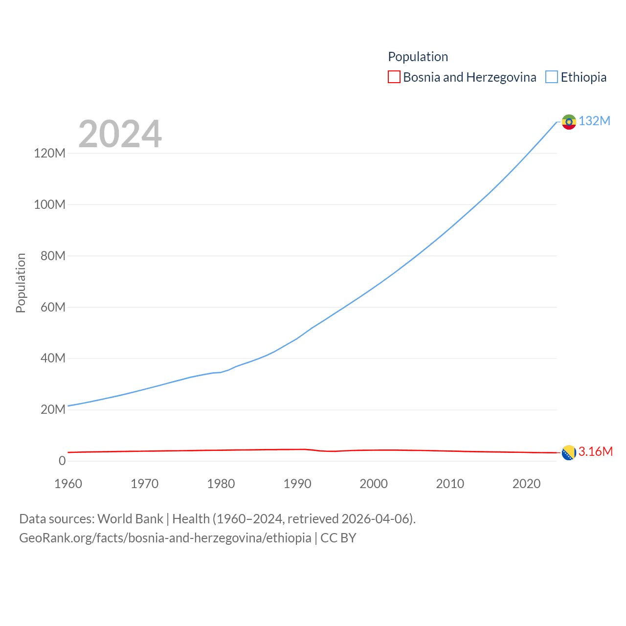 Bosnia and Herzegovina has a population of 3.16M (ranked 134/197), compared with 132M in Ethiopia (ranked 10/197). Bosnia and Herzegovina's land area is 19,768 sq mi versus 435,716 sq mi for Ethiopia (ranked 125th vs. 25th).