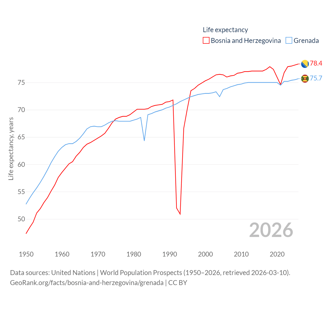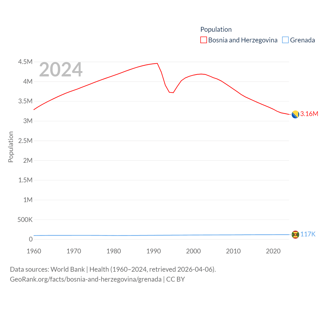Bosnia and Herzegovina has a population of 3.16M (ranked 134/197), compared with 117K in Grenada (ranked 182/197). Bosnia and Herzegovina's land area is 19,768 sq mi versus 131.3 sq mi for Grenada (ranked 125th vs. 186th).