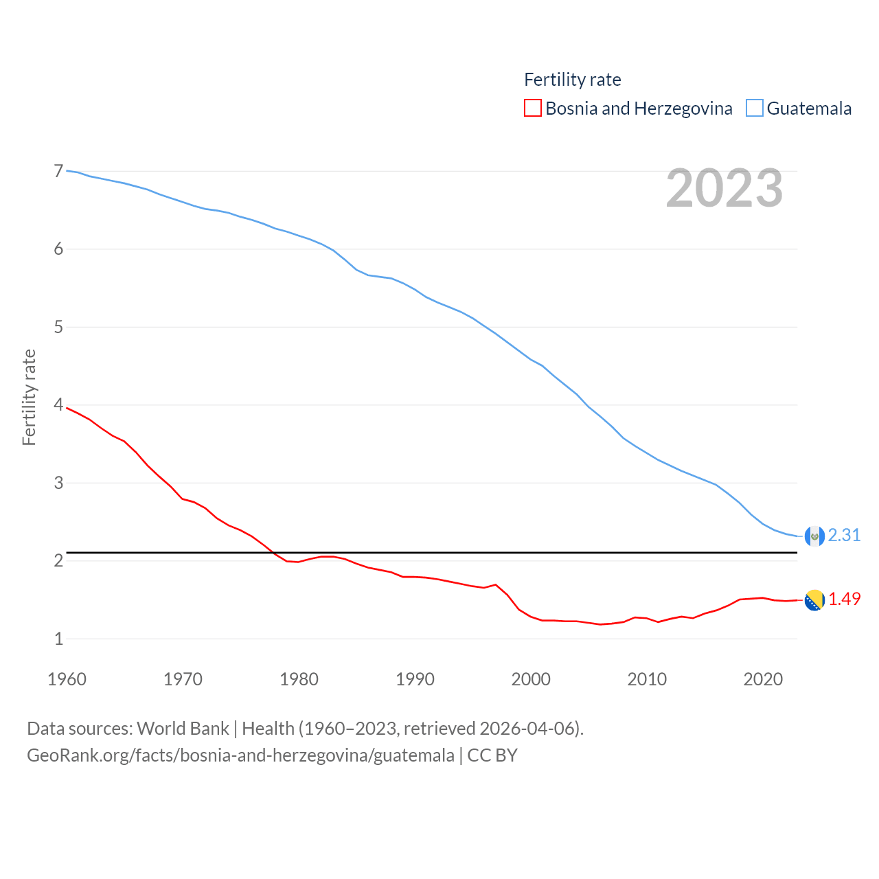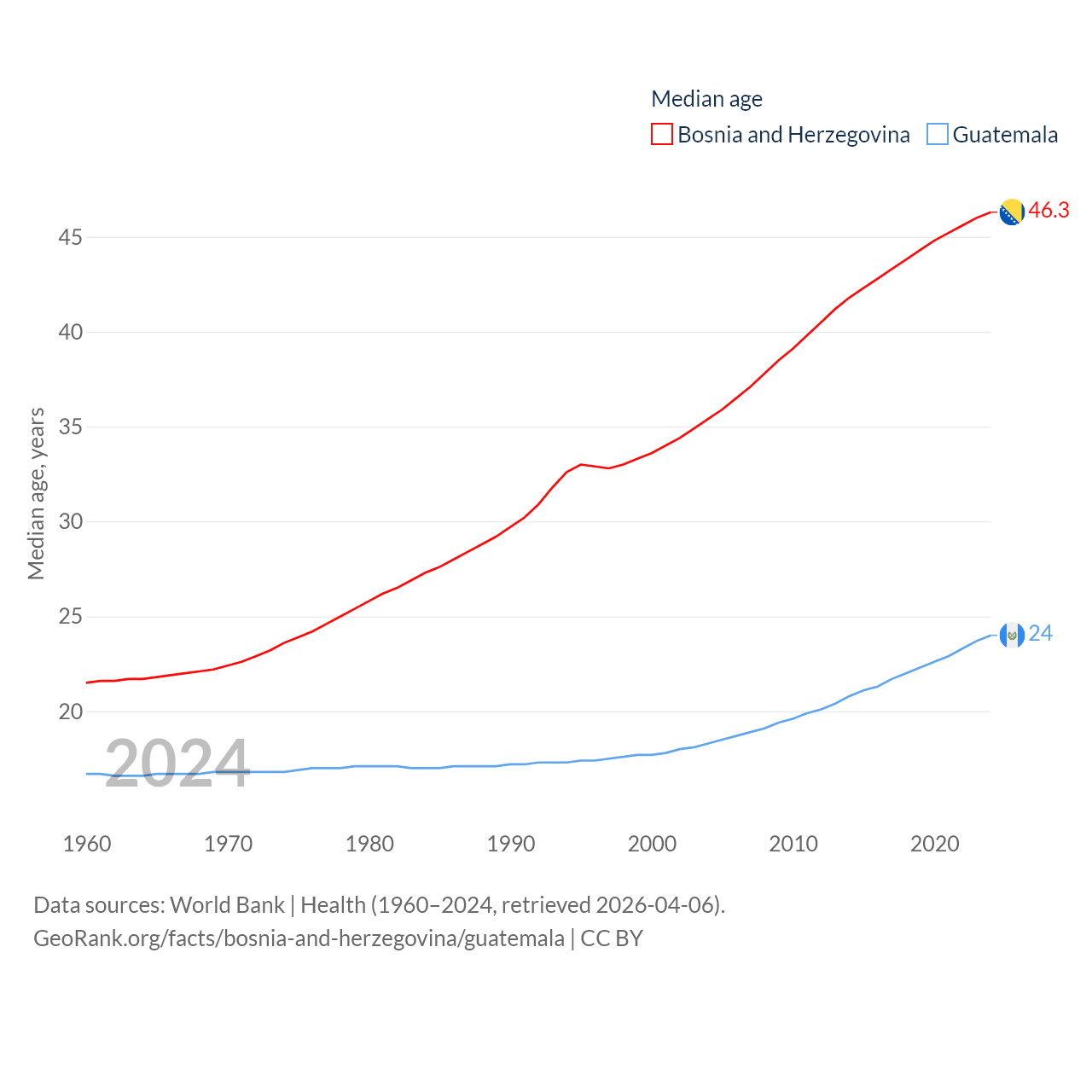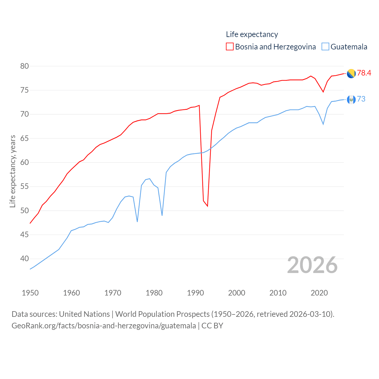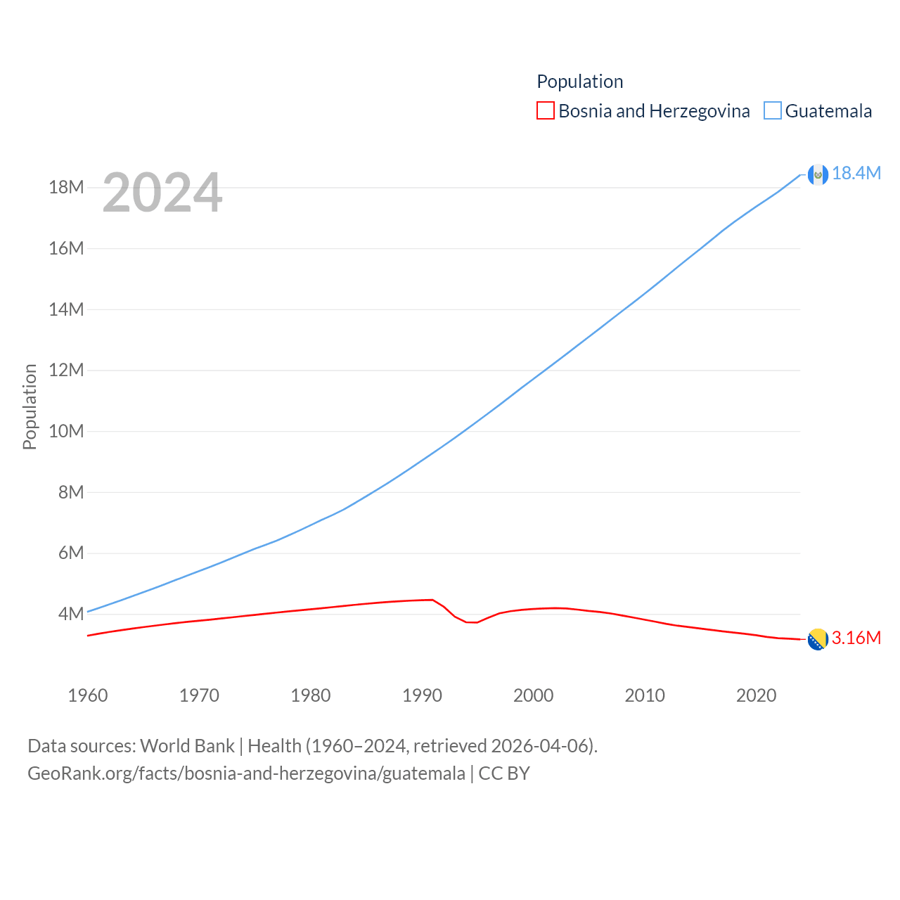 Bosnia and Herzegovina has a population of 3.16M (ranked 134/197), compared with 18.4M in Guatemala (ranked 70/197). Bosnia and Herzegovina's land area is 19,768 sq mi versus 41,375 sq mi for Guatemala (ranked 125th vs. 102nd).