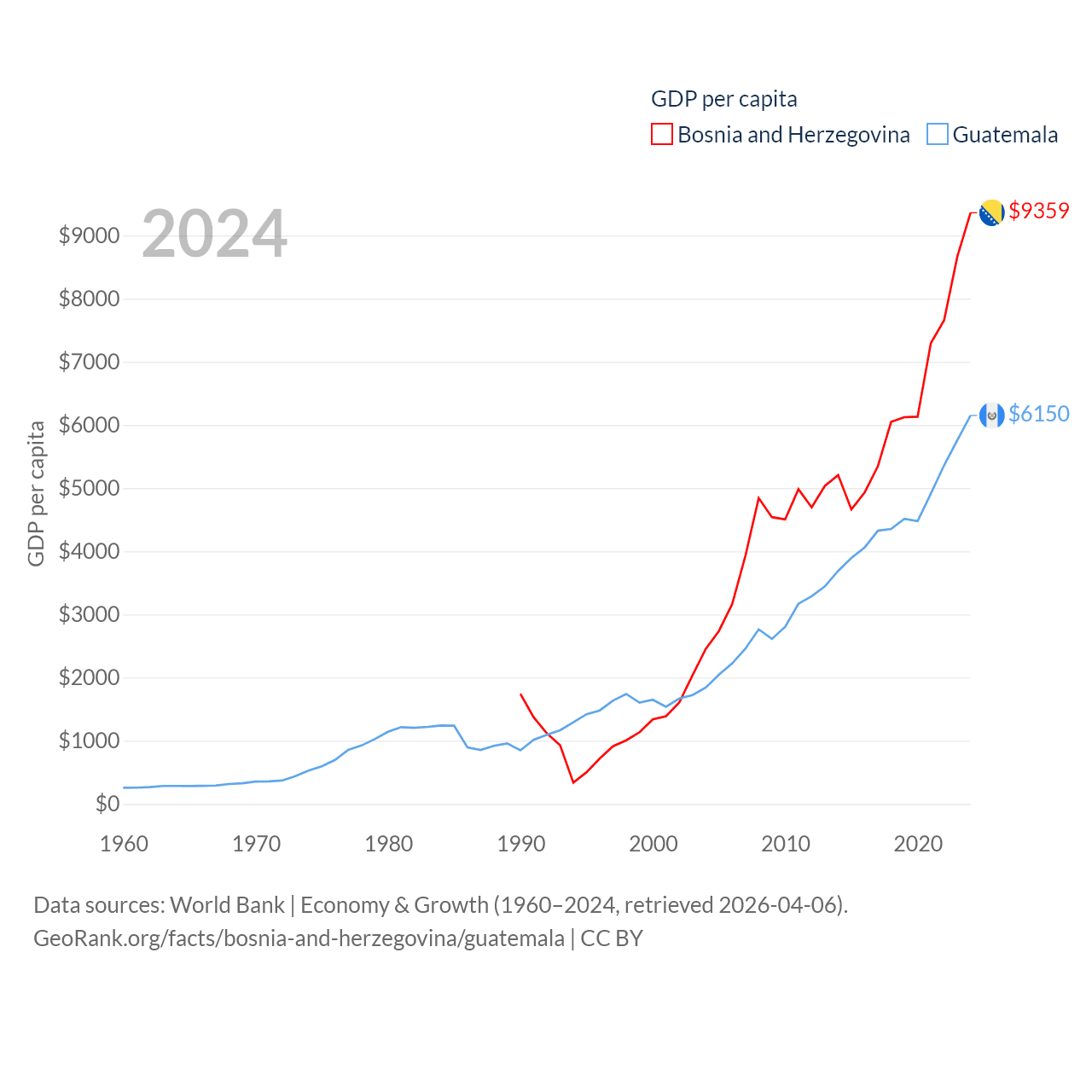 By GDP, Bosnia and Herzegovina ranks 111/197 ($29.6B) and Guatemala ranks 68/197 ($113B). By GDP per capita, Bosnia and Herzegovina ranks 87/197 ($9,359), while Guatemala ranks 112/197 ($6,150).