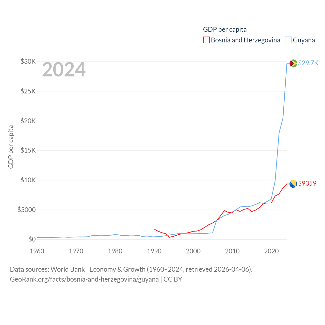 By GDP, Bosnia and Herzegovina ranks 111/197 ($29.6B) and Guyana ranks 120/197 ($24.7B). By GDP per capita, Bosnia and Herzegovina ranks 87/197 ($9,359), while Guyana ranks 41/197 ($29,675).