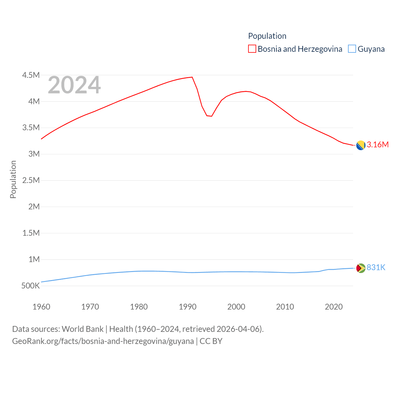 Bosnia and Herzegovina has a population of 3.16M (ranked 134/197), compared with 831K in Guyana (ranked 161/197). Bosnia and Herzegovina's land area is 19,768 sq mi versus 81,522 sq mi for Guyana (ranked 125th vs. 82nd).