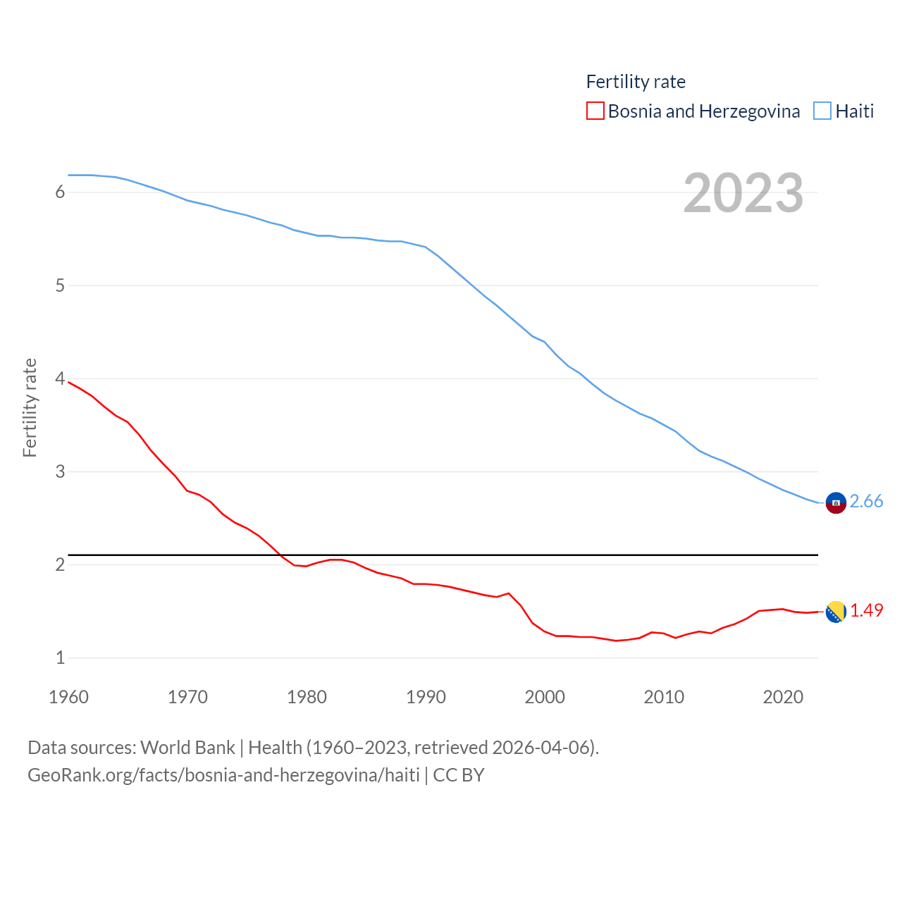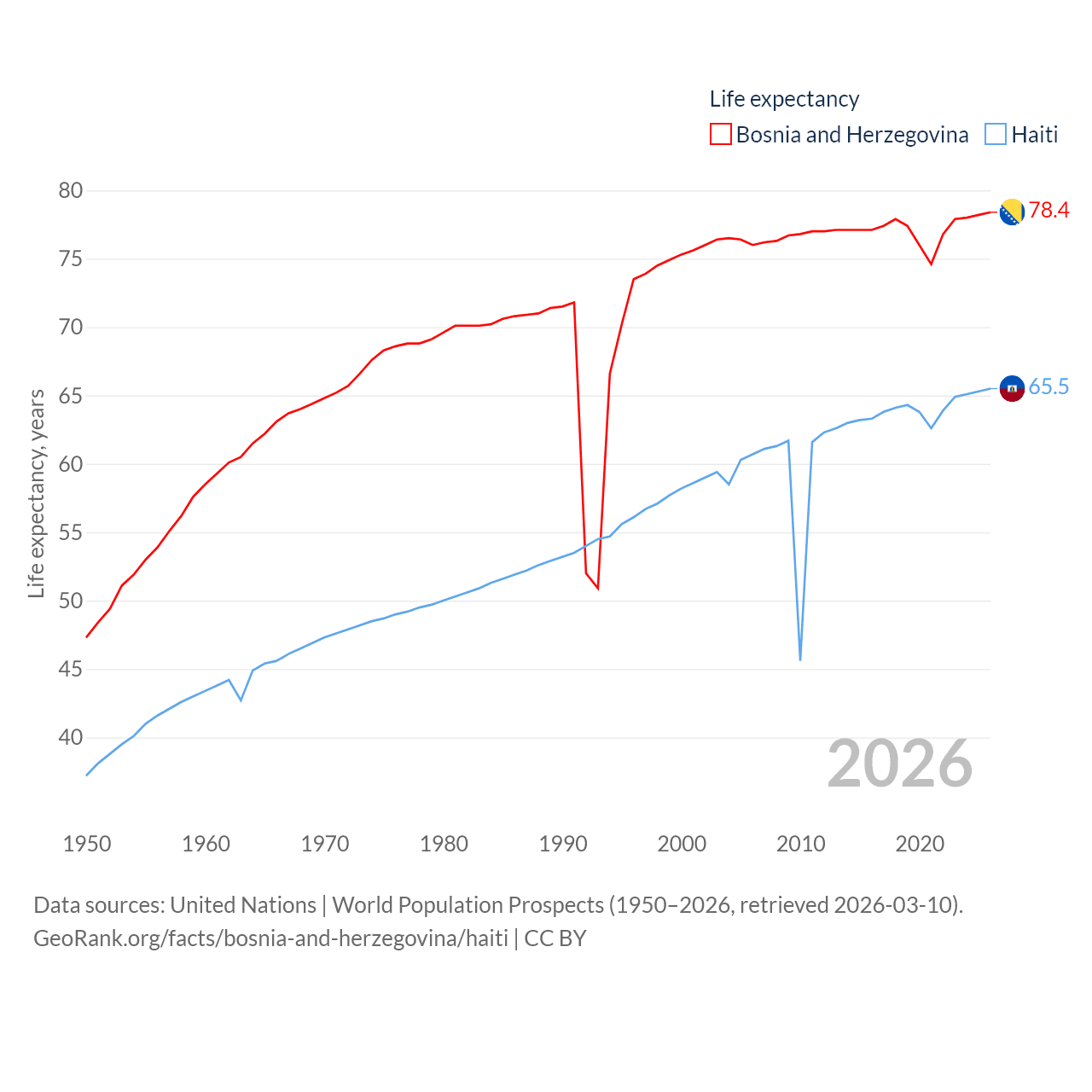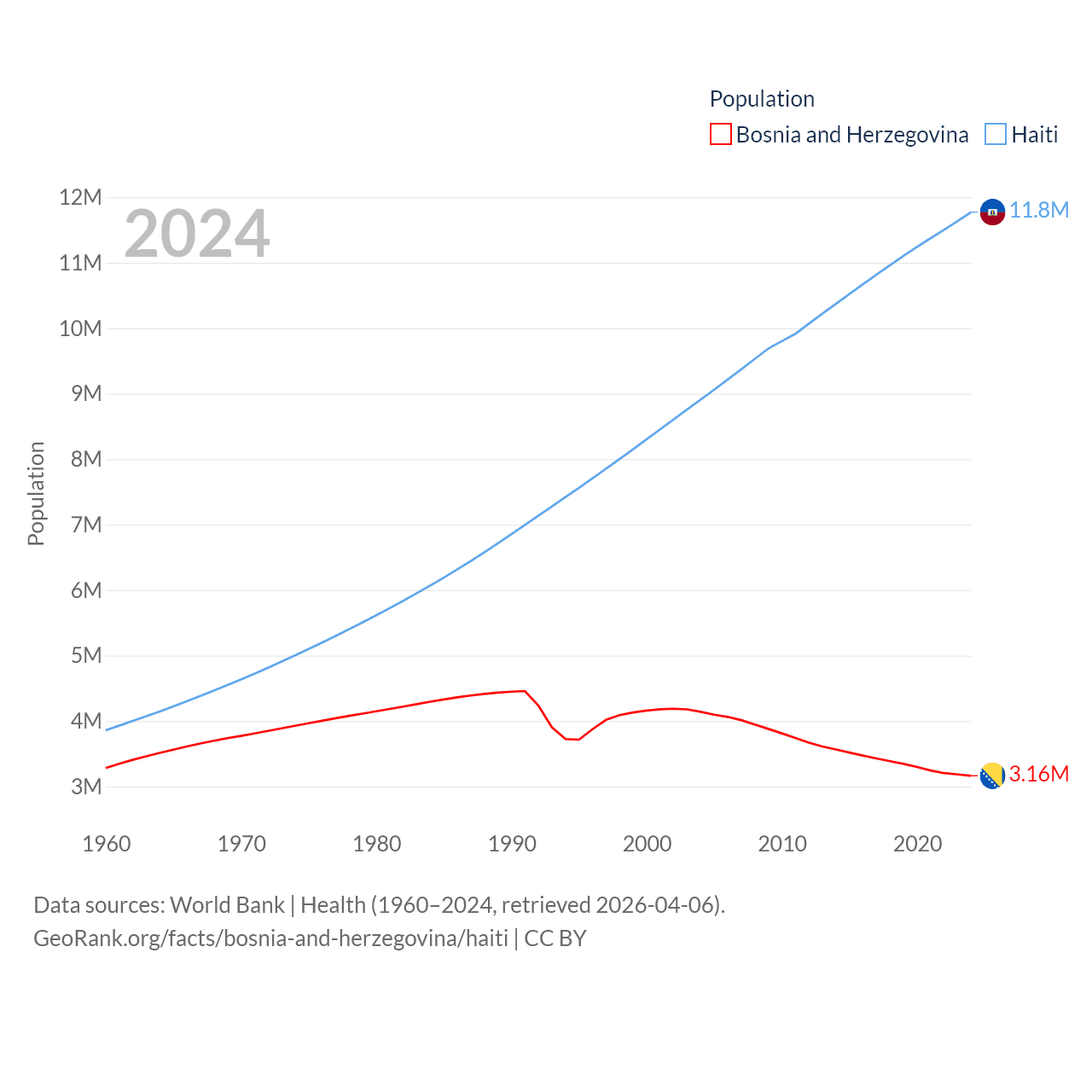 Bosnia and Herzegovina has a population of 3.16M (ranked 134/197), compared with 11.8M in Haiti (ranked 83/197). Bosnia and Herzegovina's land area is 19,768 sq mi versus 10,641 sq mi for Haiti (ranked 125th vs. 142nd).