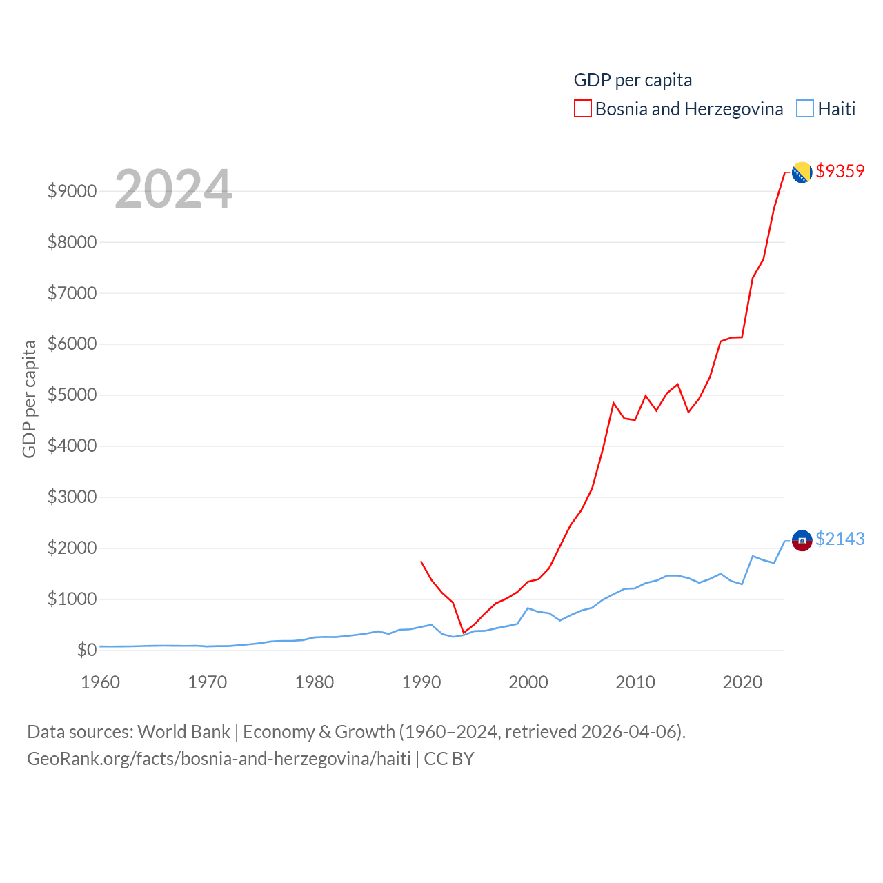 By GDP, Bosnia and Herzegovina ranks 111/197 ($29.6B) and Haiti ranks 117/197 ($25.2B). By GDP per capita, Bosnia and Herzegovina ranks 87/197 ($9,359), while Haiti ranks 153/197 ($2,143).