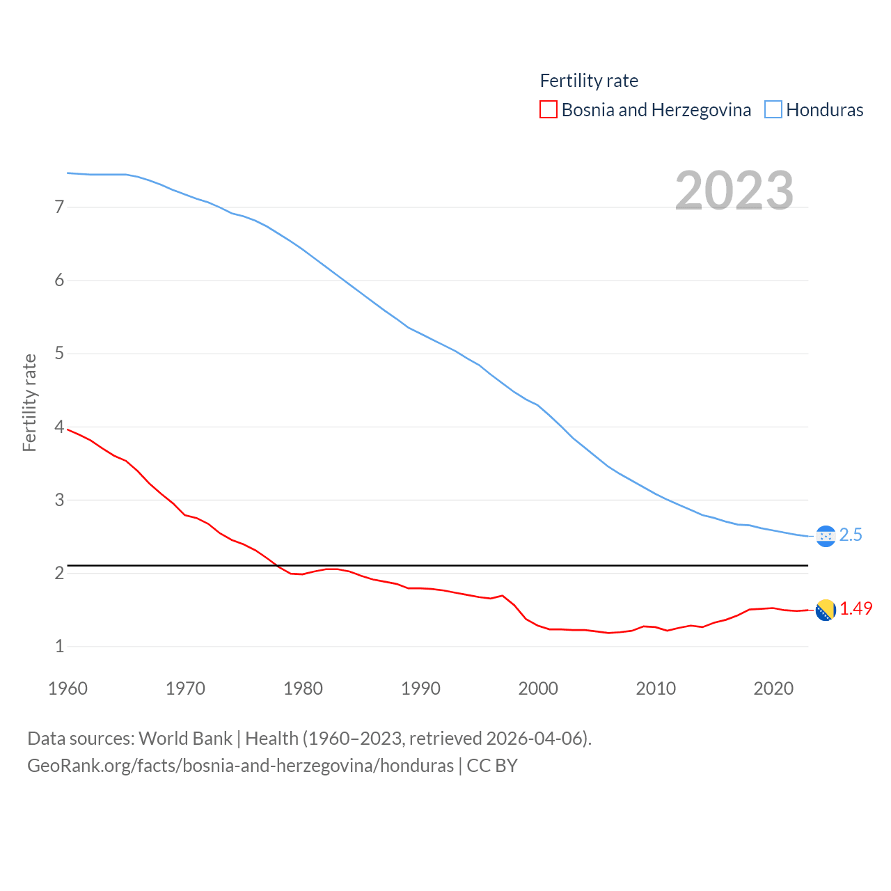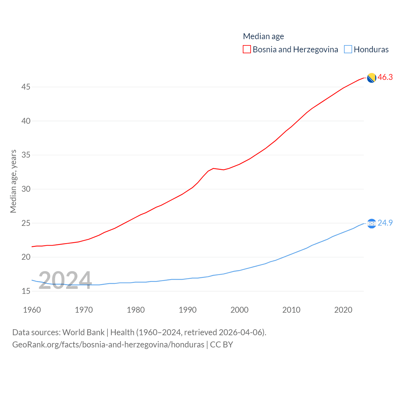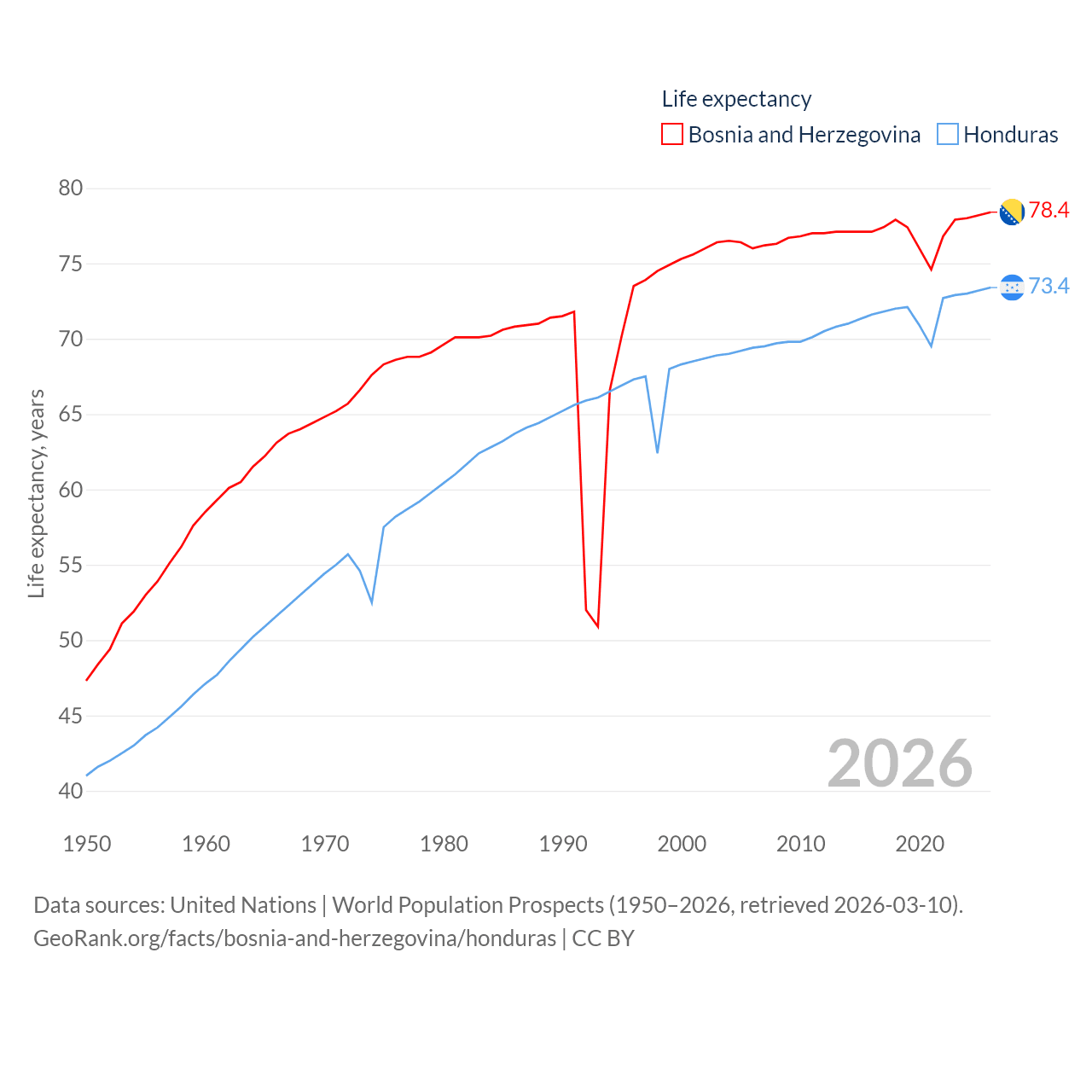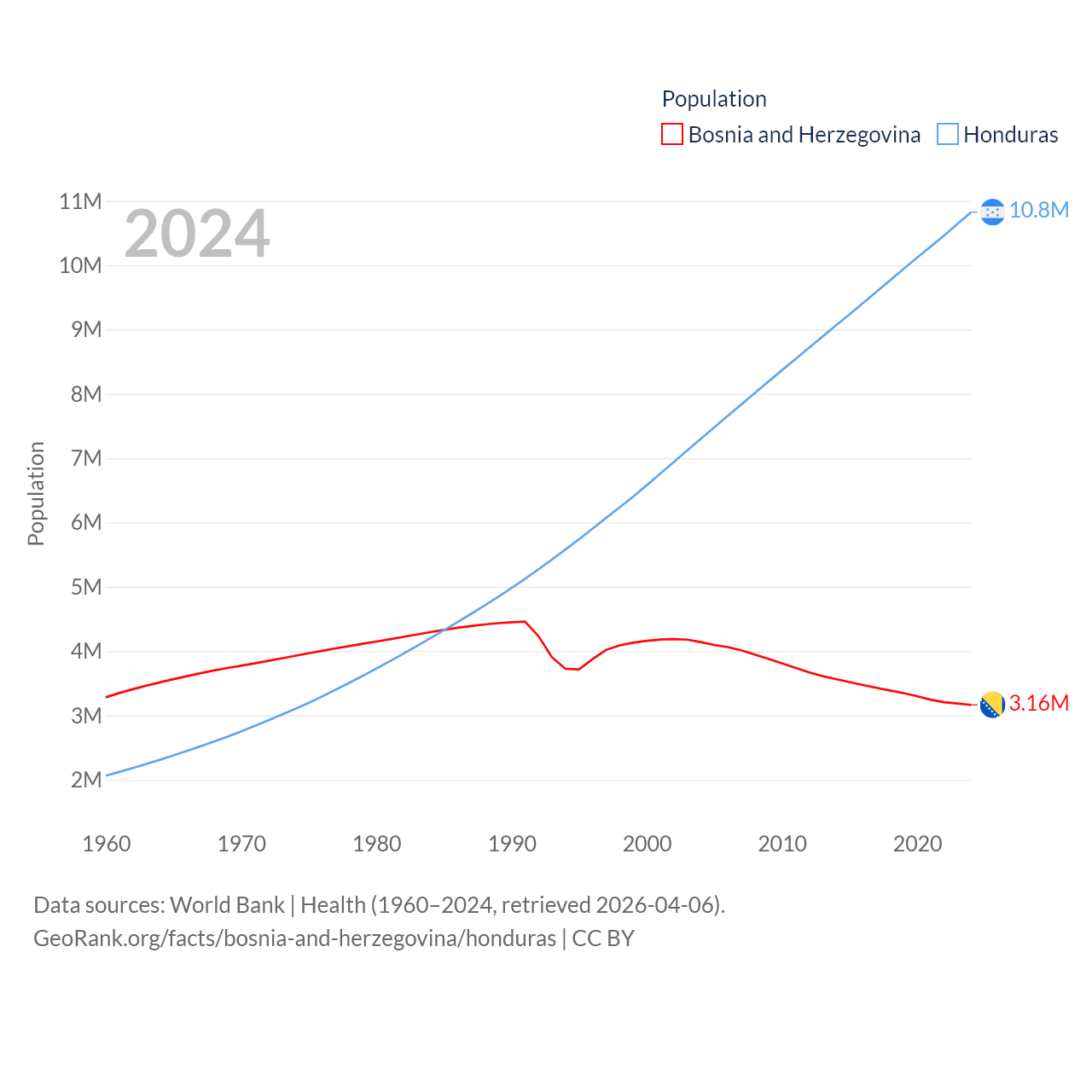 Bosnia and Herzegovina has a population of 3.16M (ranked 134/197), compared with 10.8M in Honduras (ranked 89/197). Bosnia and Herzegovina's land area is 19,768 sq mi versus 43,201 sq mi for Honduras (ranked 125th vs. 100th).