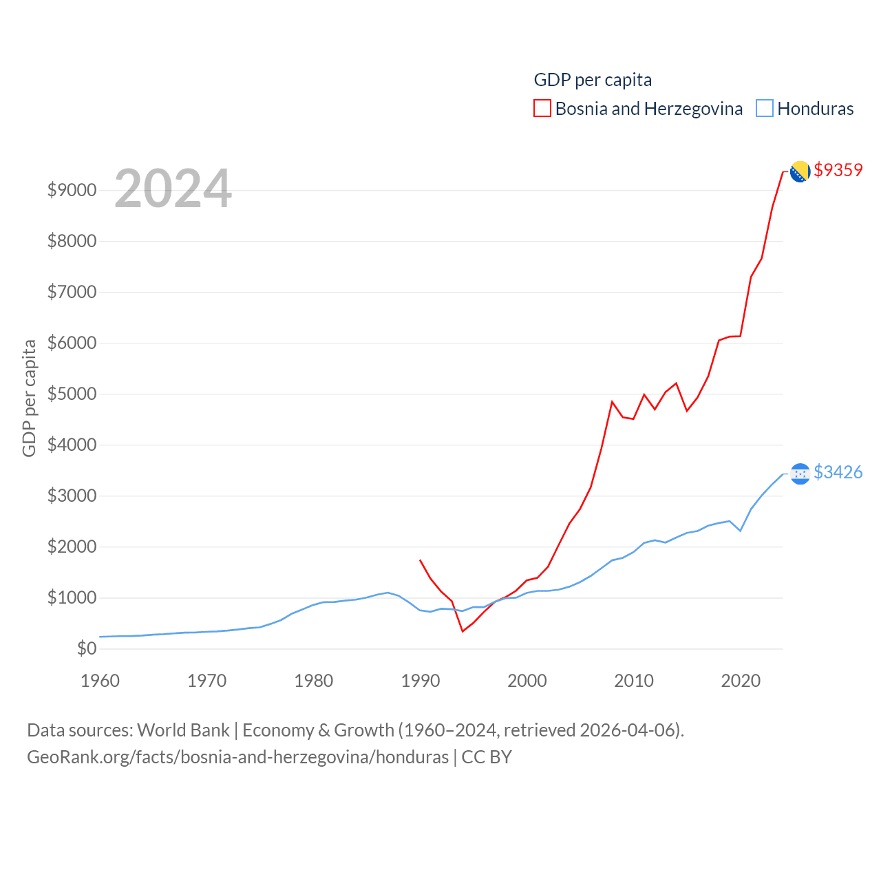 By GDP, Bosnia and Herzegovina ranks 111/197 ($29.6B) and Honduras ranks 104/197 ($37.1B). By GDP per capita, Bosnia and Herzegovina ranks 87/197 ($9,359), while Honduras ranks 136/197 ($3,426).