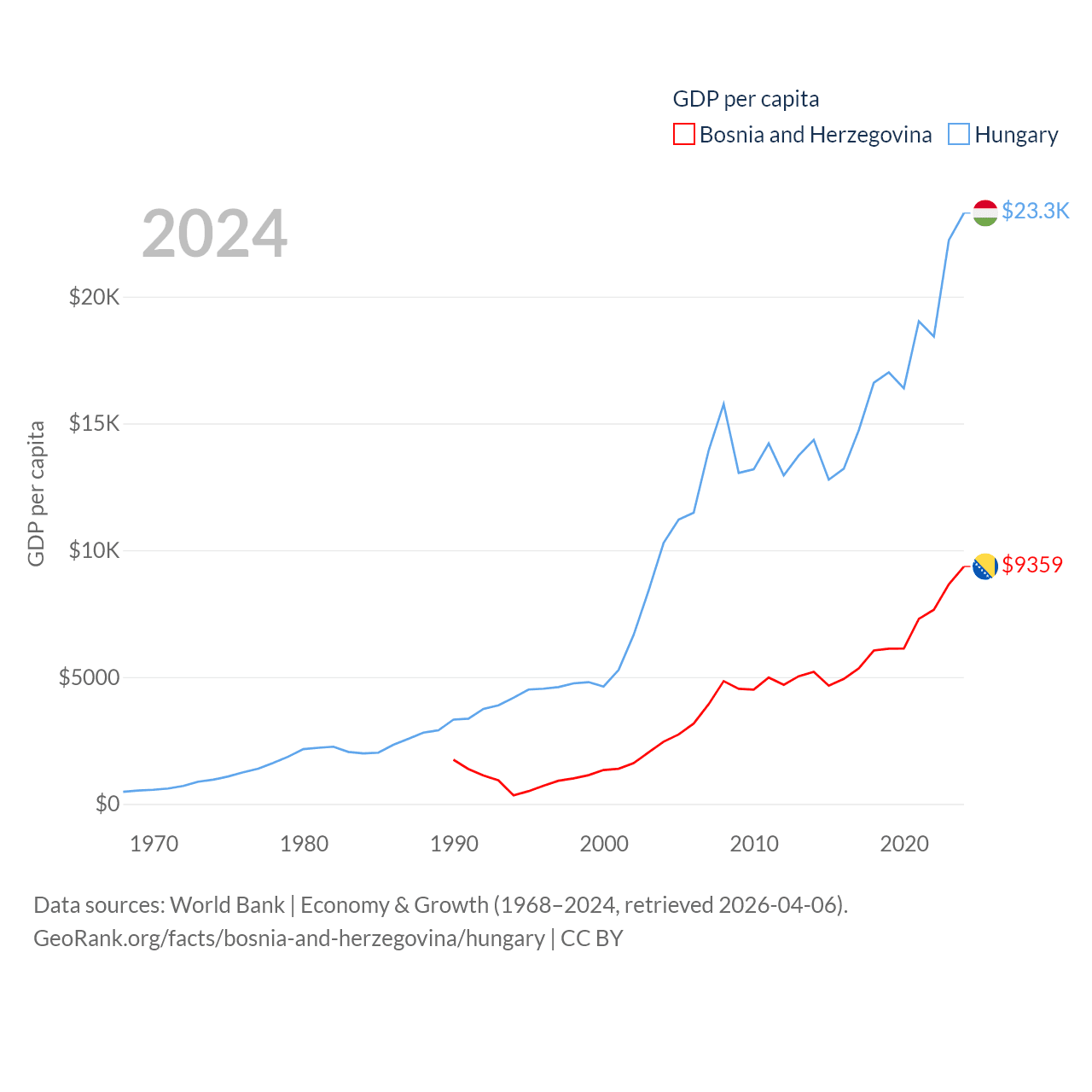 By GDP, Bosnia and Herzegovina ranks 111/197 ($29.6B) and Hungary ranks 55/197 ($223B). By GDP per capita, Bosnia and Herzegovina ranks 87/197 ($9,359), while Hungary ranks 55/197 ($23,292).