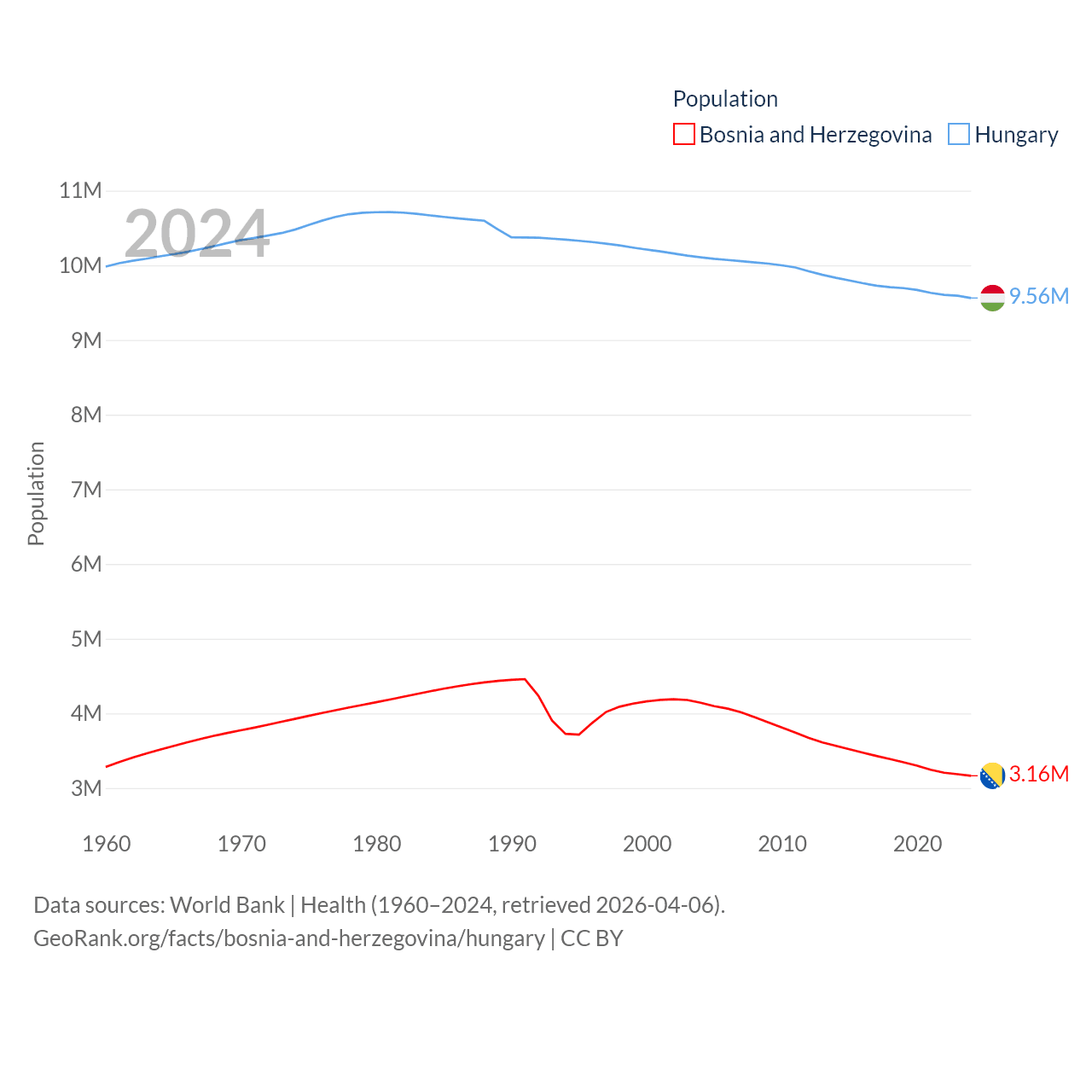 Bosnia and Herzegovina has a population of 3.16M (ranked 134/197), compared with 9.56M in Hungary (ranked 97/197). Bosnia and Herzegovina's land area is 19,768 sq mi versus 35,236 sq mi for Hungary (ranked 125th vs. 109th).