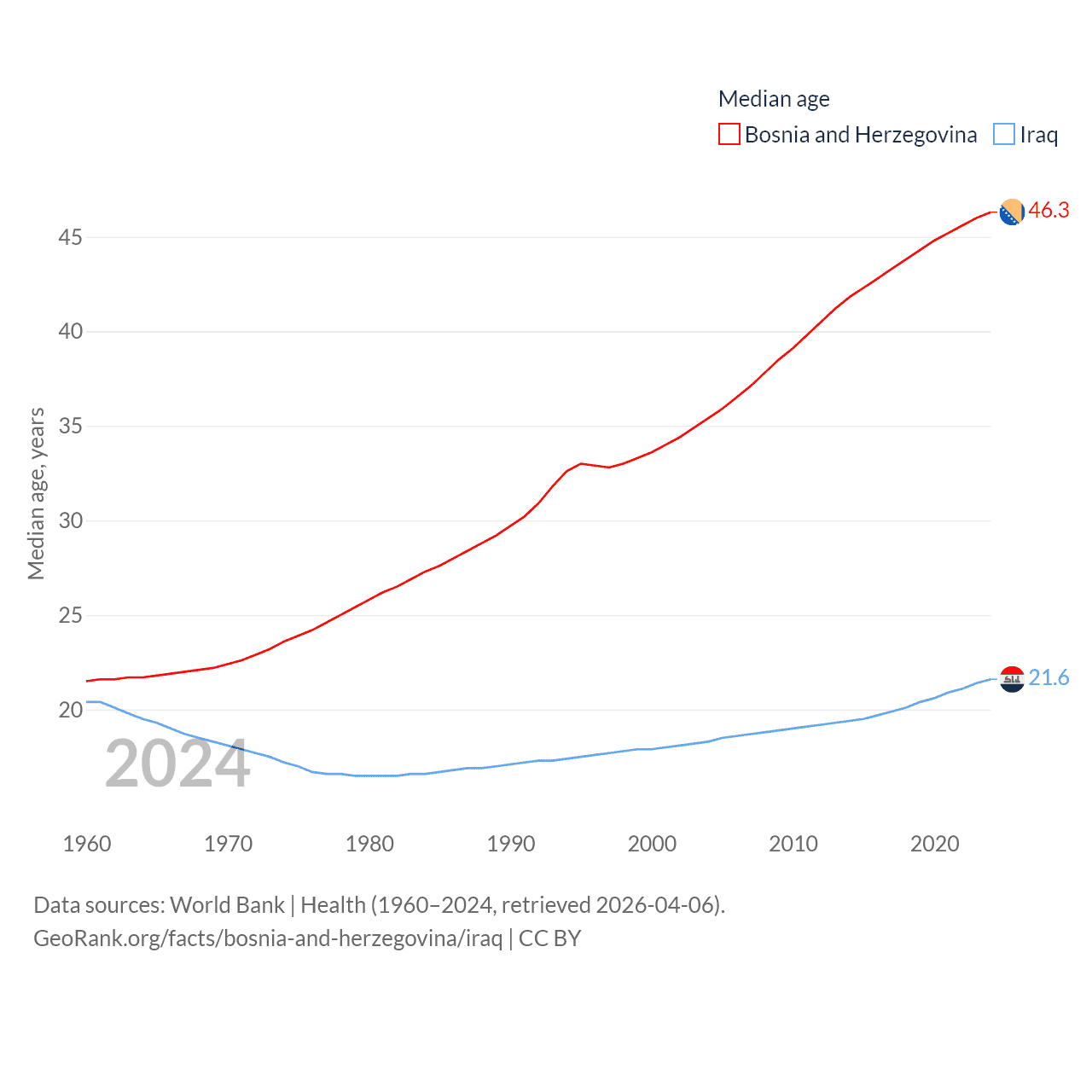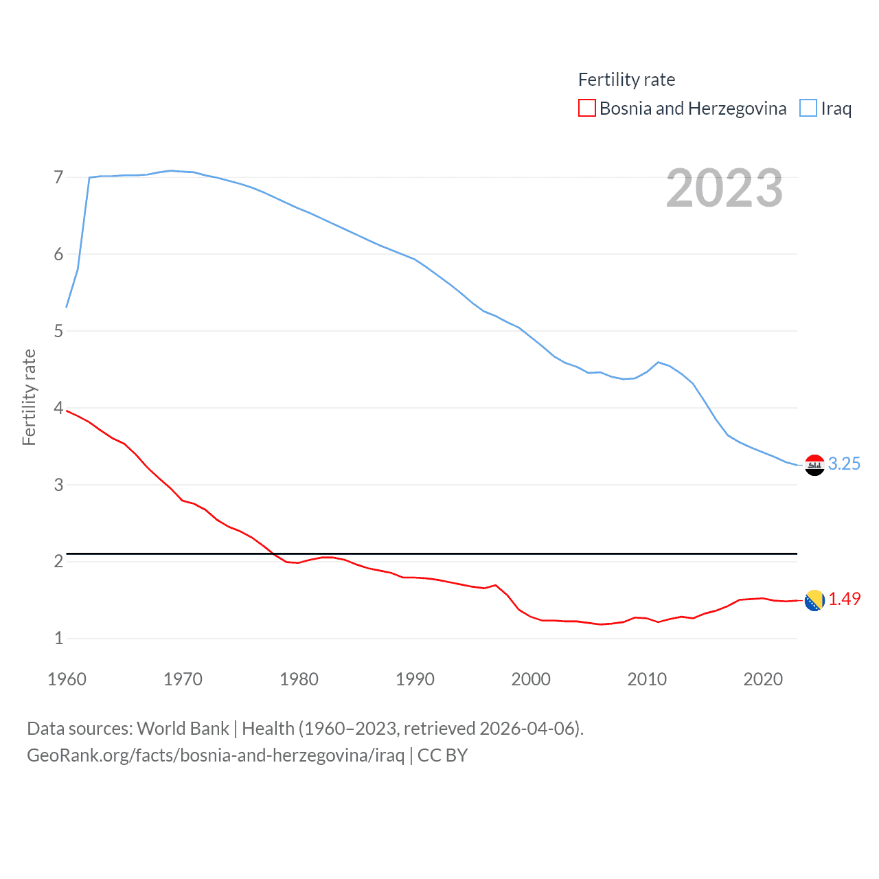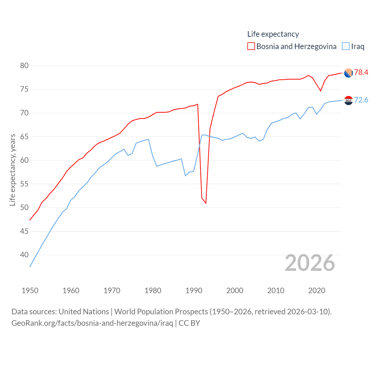 Bosnia and Herzegovina has a population of 3.16M (ranked 134/197), compared with 46M in Iraq (ranked 34/197). Bosnia and Herzegovina's land area is 19,768 sq mi versus 167,619 sq mi for Iraq (ranked 125th vs. 57th).