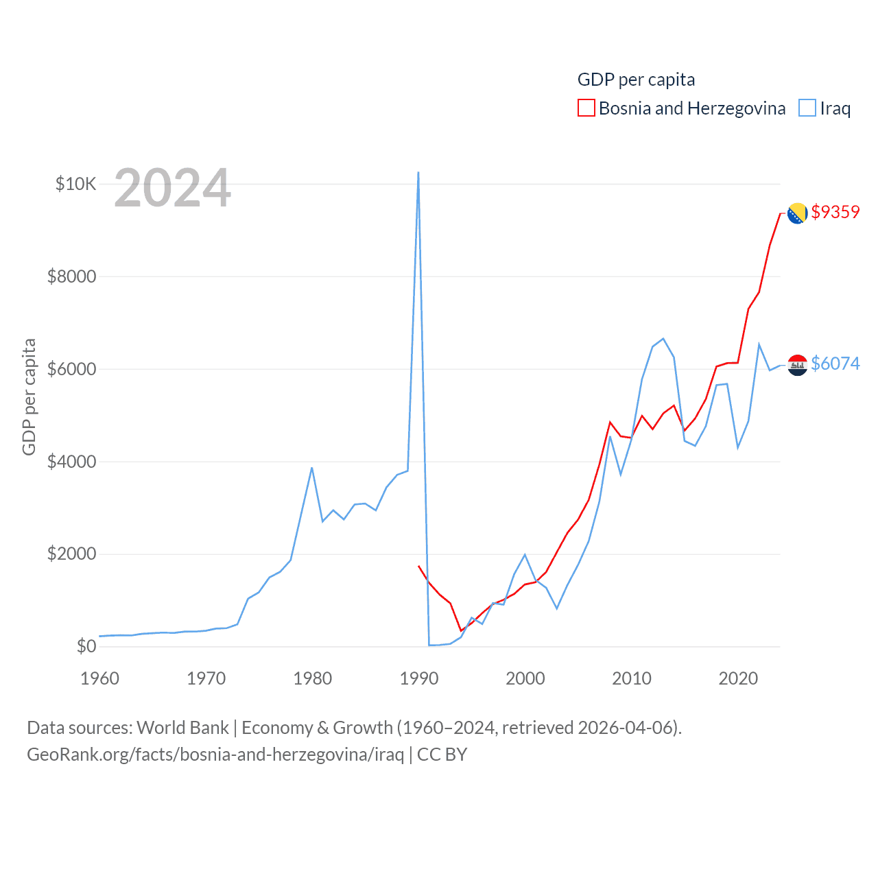 By GDP, Bosnia and Herzegovina ranks 111/197 ($29.6B) and Iraq ranks 50/197 ($280B). By GDP per capita, Bosnia and Herzegovina ranks 87/197 ($9,359), while Iraq ranks 113/197 ($6,074).