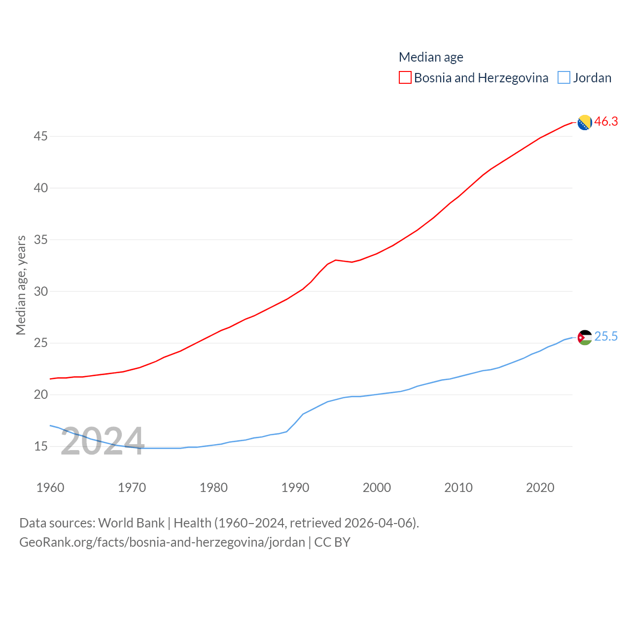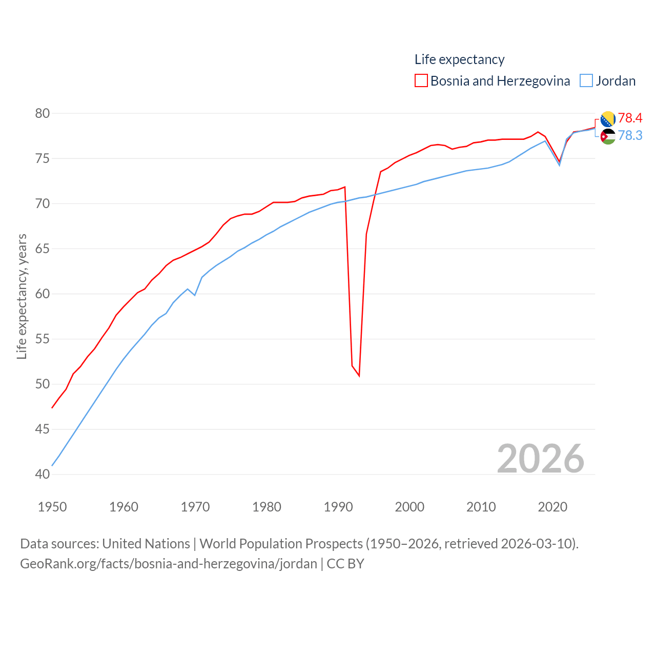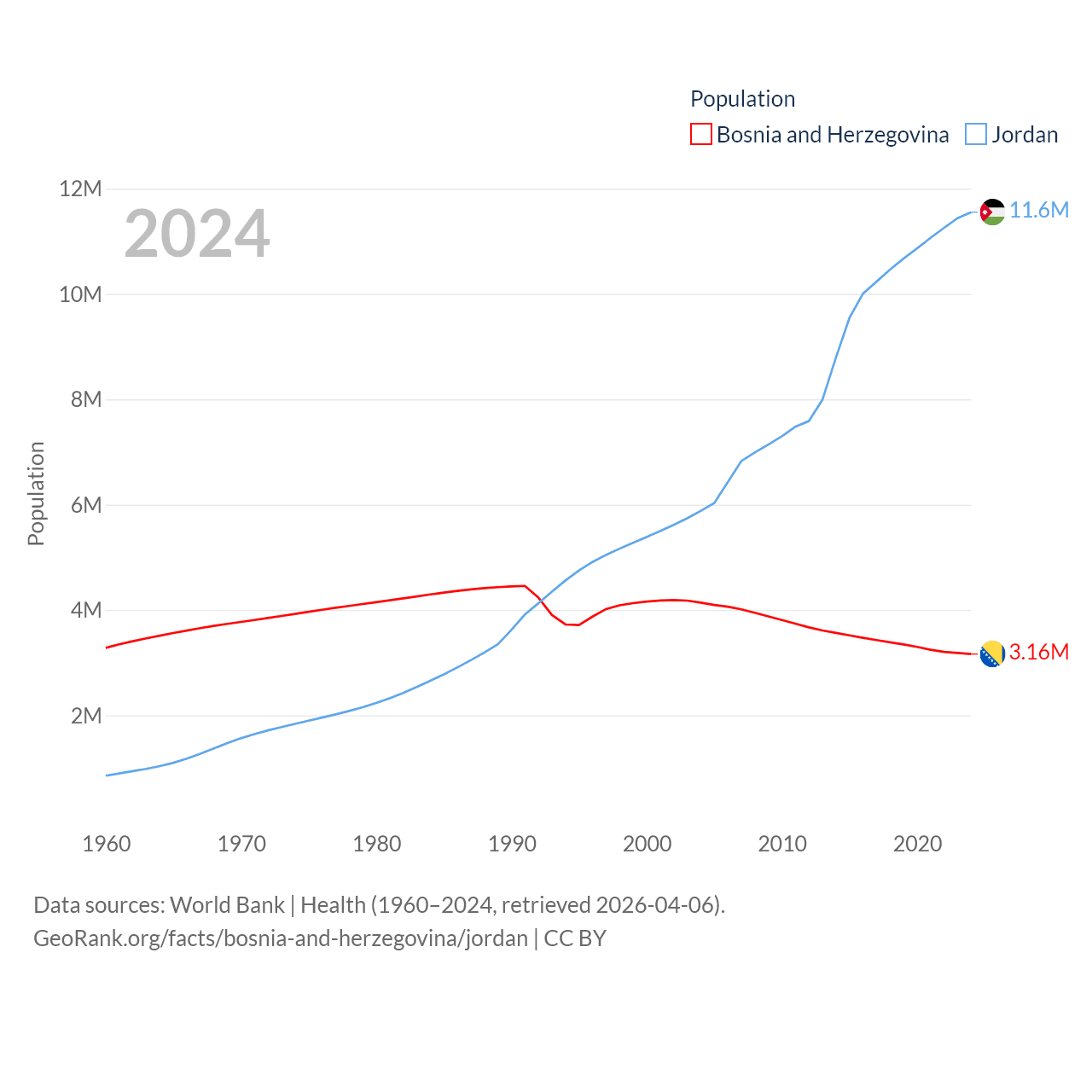 Bosnia and Herzegovina has a population of 3.16M (ranked 134/197), compared with 11.6M in Jordan (ranked 84/197). Bosnia and Herzegovina's land area is 19,768 sq mi versus 34,284 sq mi for Jordan (ranked 125th vs. 110th).