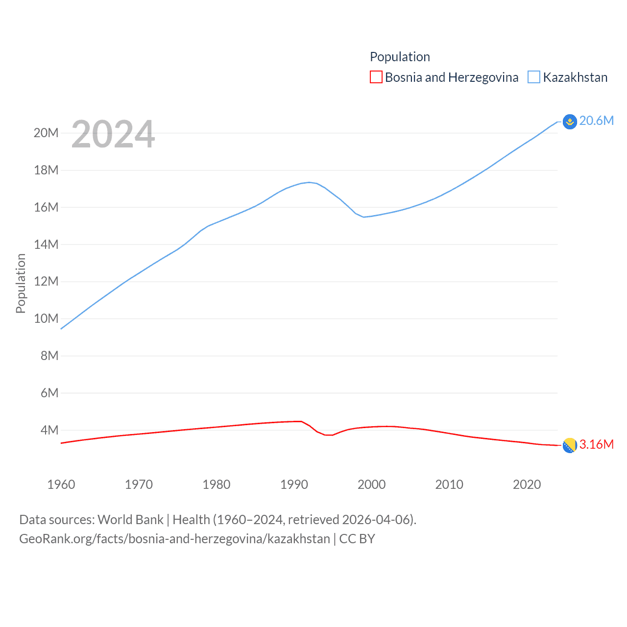 Bosnia and Herzegovina has a population of 3.16M (ranked 134/197), compared with 20.6M in Kazakhstan (ranked 64/197). Bosnia and Herzegovina's land area is 19,768 sq mi versus 1,042,360 sq mi for Kazakhstan (ranked 125th vs. 9th).