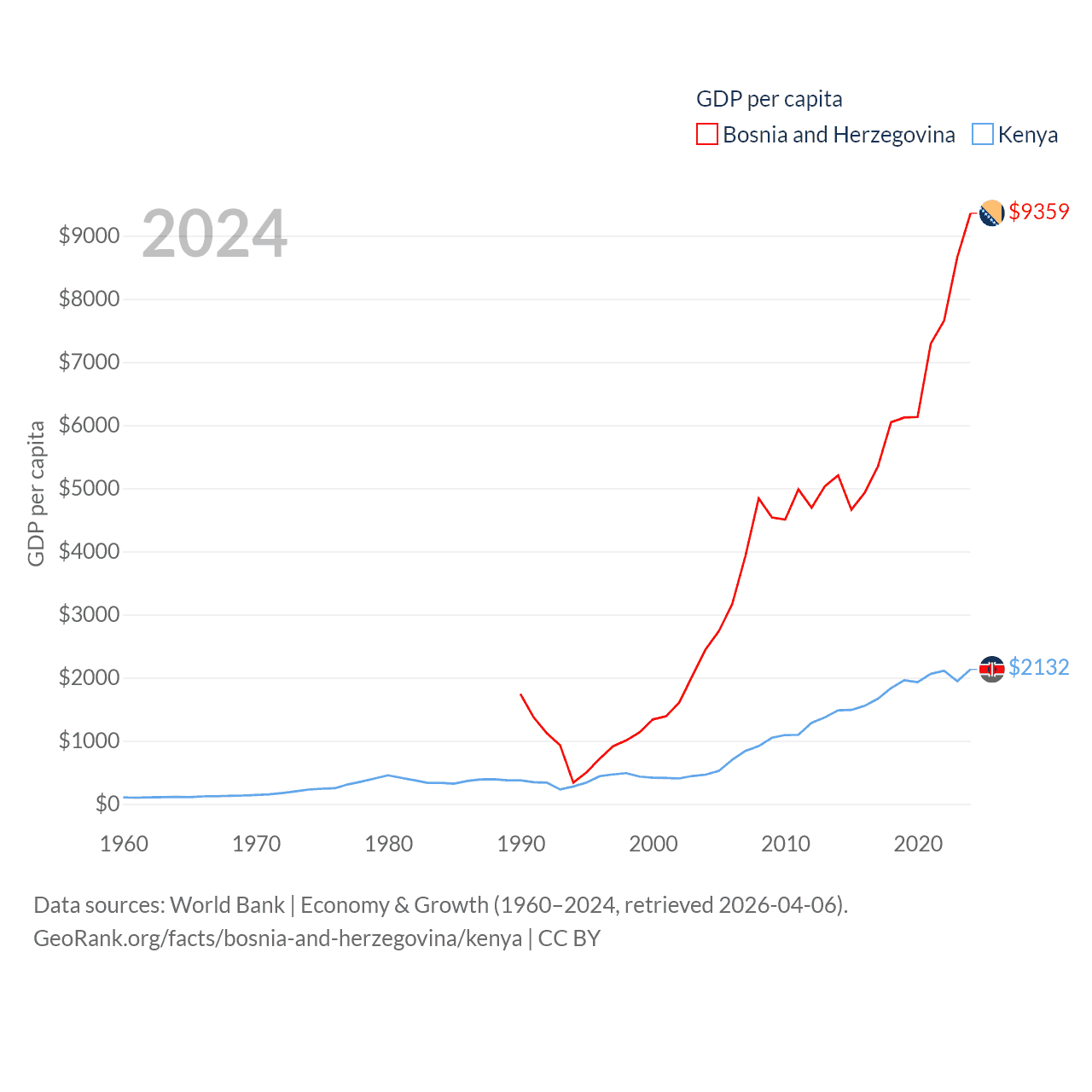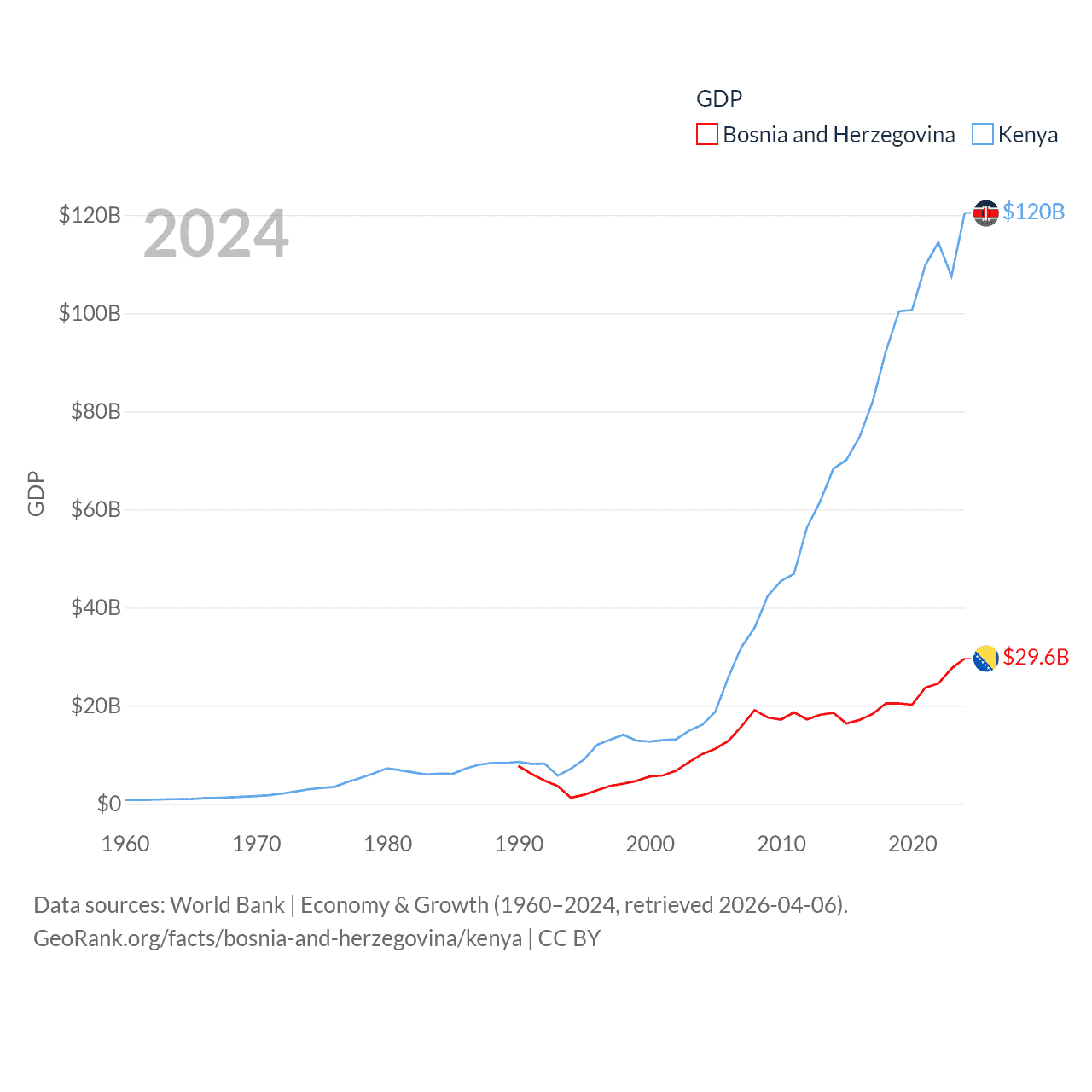 By GDP, Bosnia and Herzegovina ranks 111/197 ($29.6B) and Kenya ranks 64/197 ($120B). By GDP per capita, Bosnia and Herzegovina ranks 87/197 ($9,359), while Kenya ranks 154/197 ($2,132).