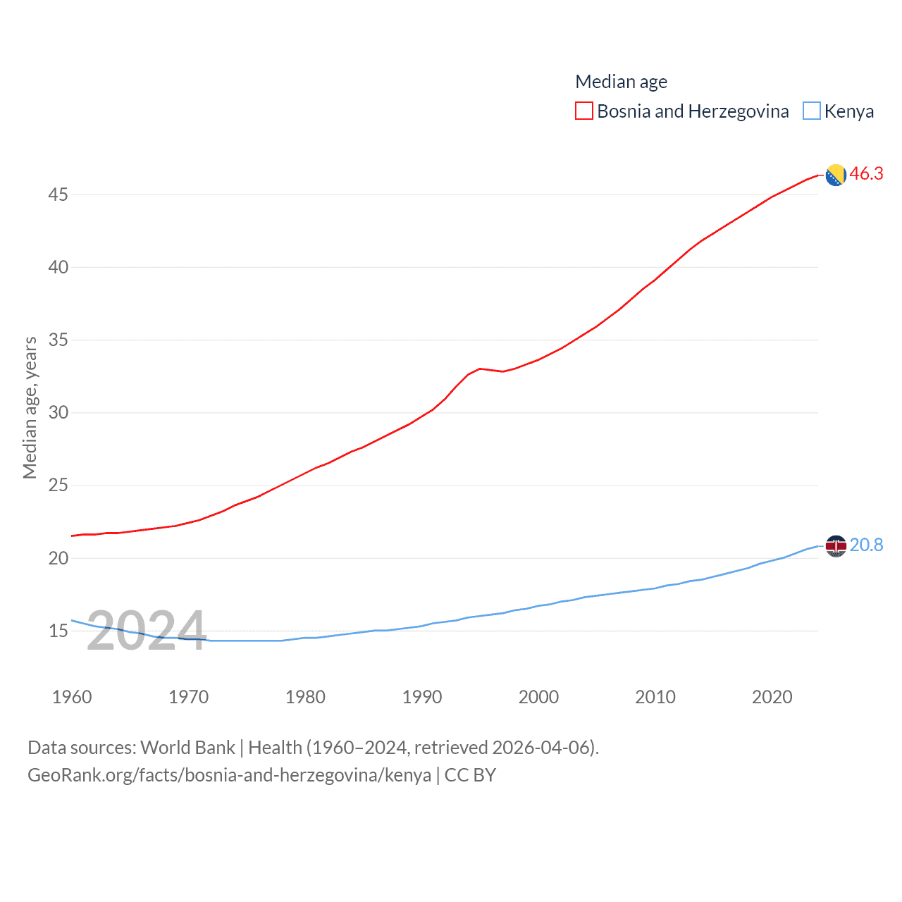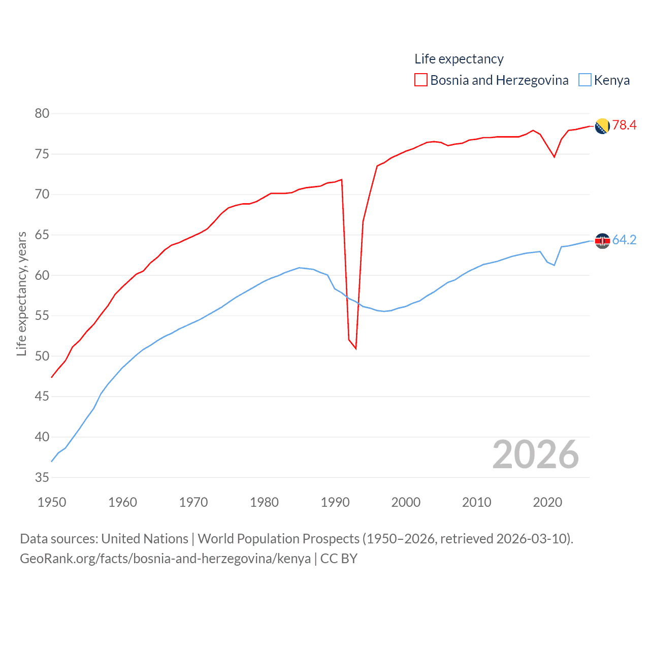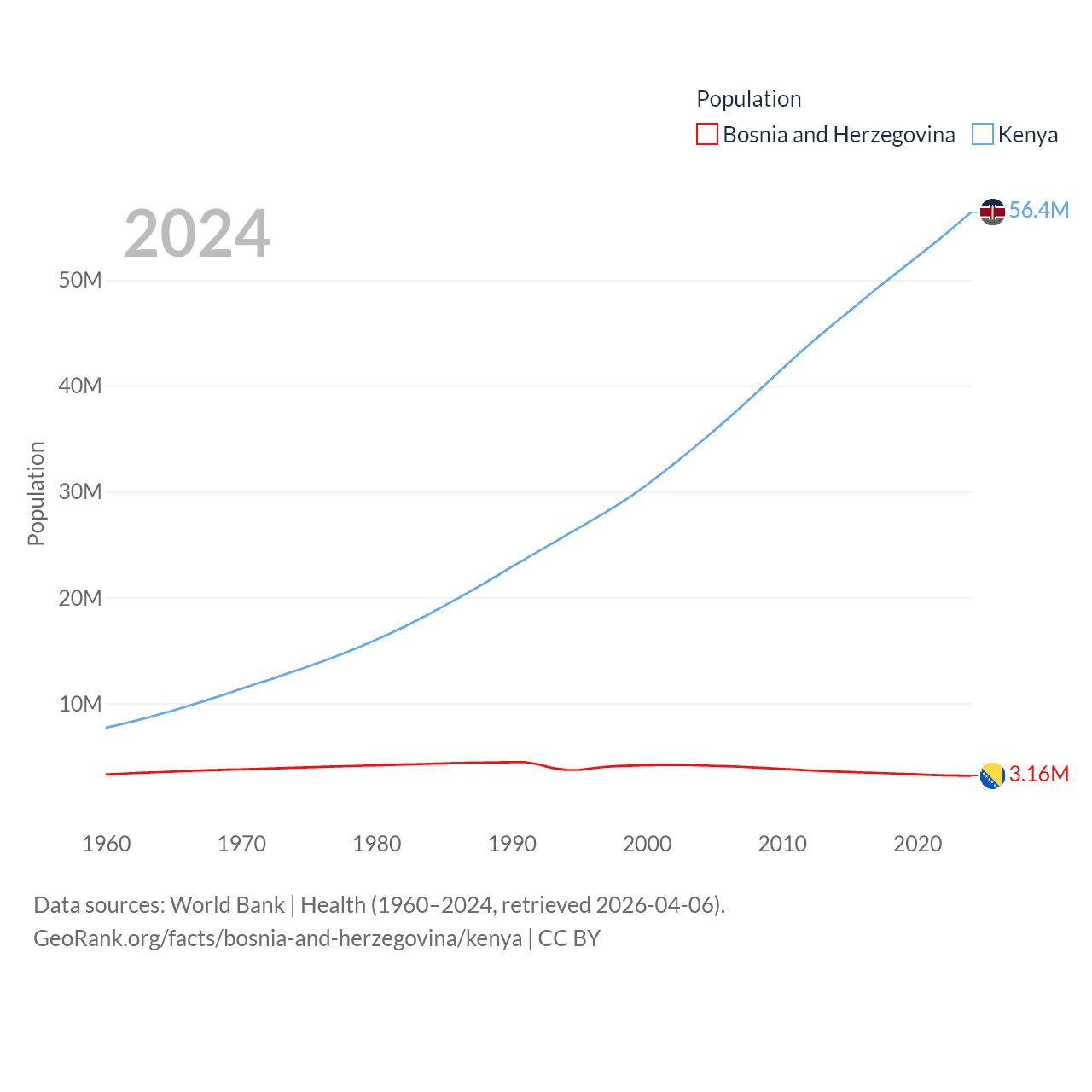 Bosnia and Herzegovina has a population of 3.16M (ranked 134/197), compared with 56.4M in Kenya (ranked 26/197). Bosnia and Herzegovina's land area is 19,768 sq mi versus 224,278 sq mi for Kenya (ranked 125th vs. 45th).