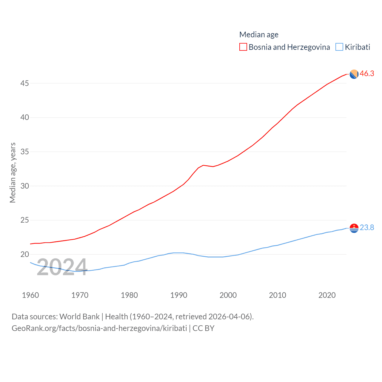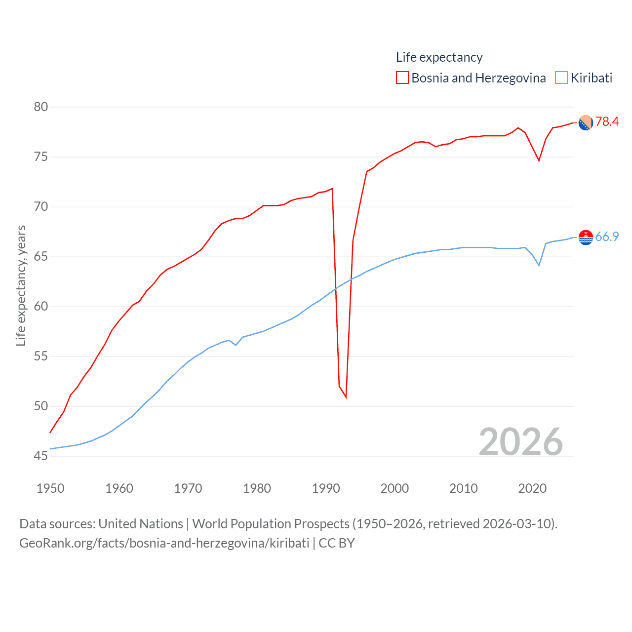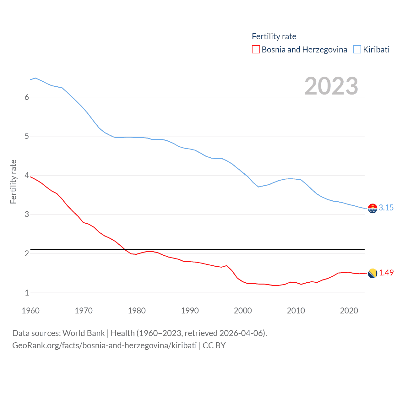 Bosnia and Herzegovina has a population of 3.16M (ranked 134/197), compared with 135K in Kiribati (ranked 180/197). Bosnia and Herzegovina's land area is 19,768 sq mi versus 313 sq mi for Kiribati (ranked 125th vs. 173rd).