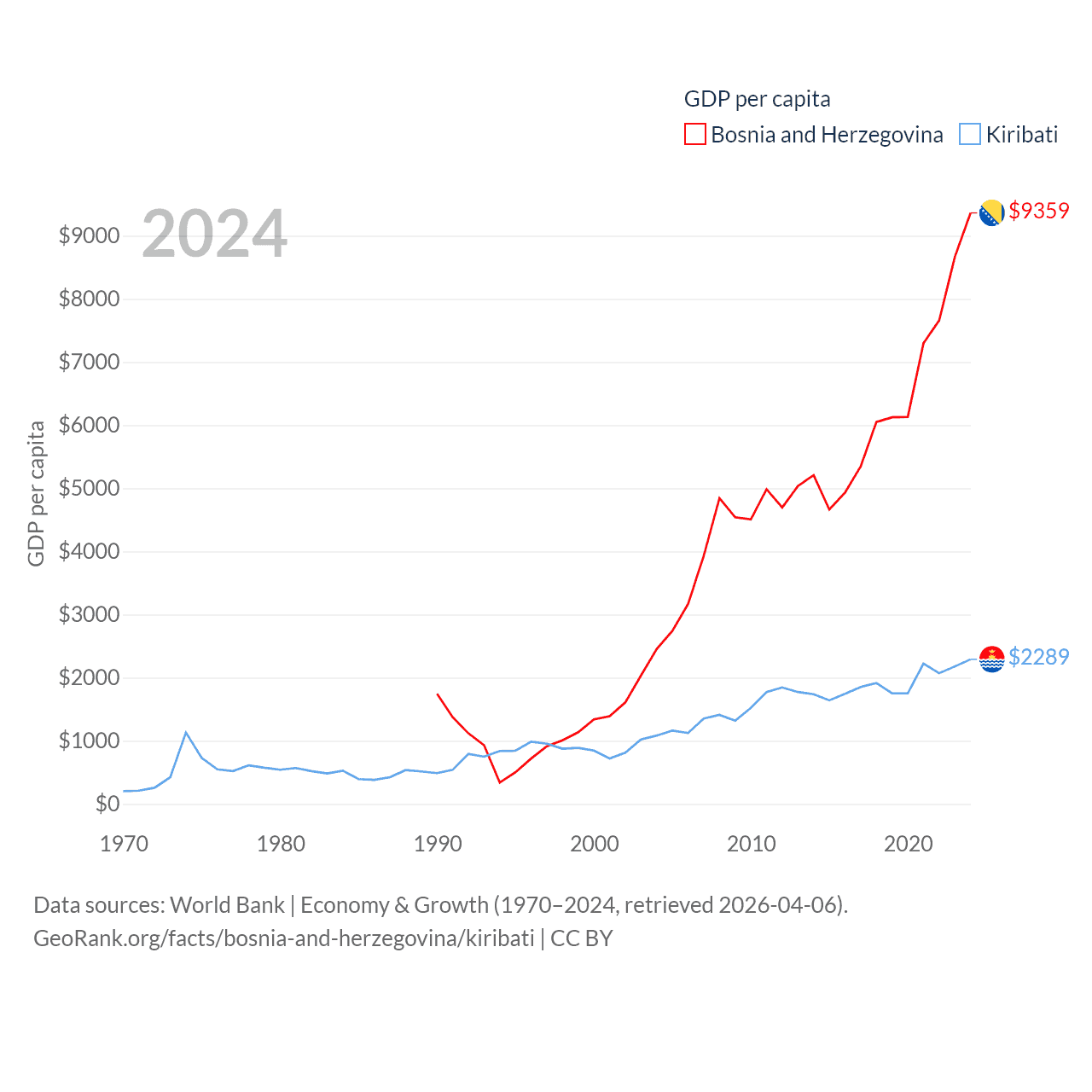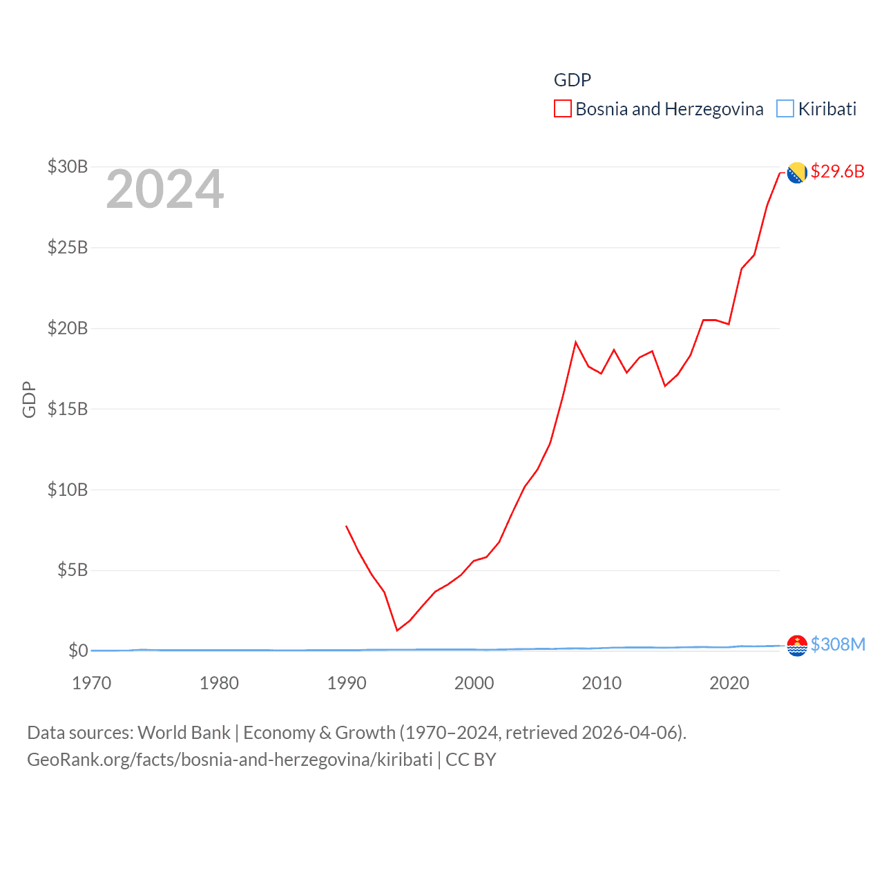 By GDP, Bosnia and Herzegovina ranks 111/197 ($29.6B) and Kiribati ranks 192/197 ($308M). By GDP per capita, Bosnia and Herzegovina ranks 87/197 ($9,359), while Kiribati ranks 152/197 ($2,289).