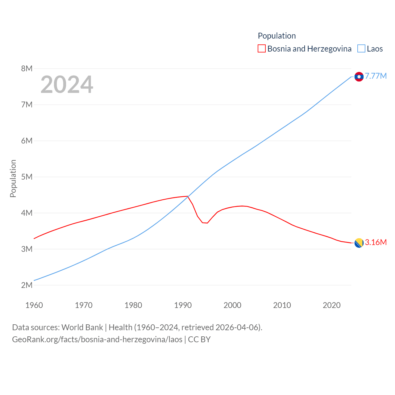 Bosnia and Herzegovina has a population of 3.16M (ranked 134/197), compared with 7.77M in Laos (ranked 103/197). Bosnia and Herzegovina's land area is 19,768 sq mi versus 89,112 sq mi for Laos (ranked 125th vs. 79th).
