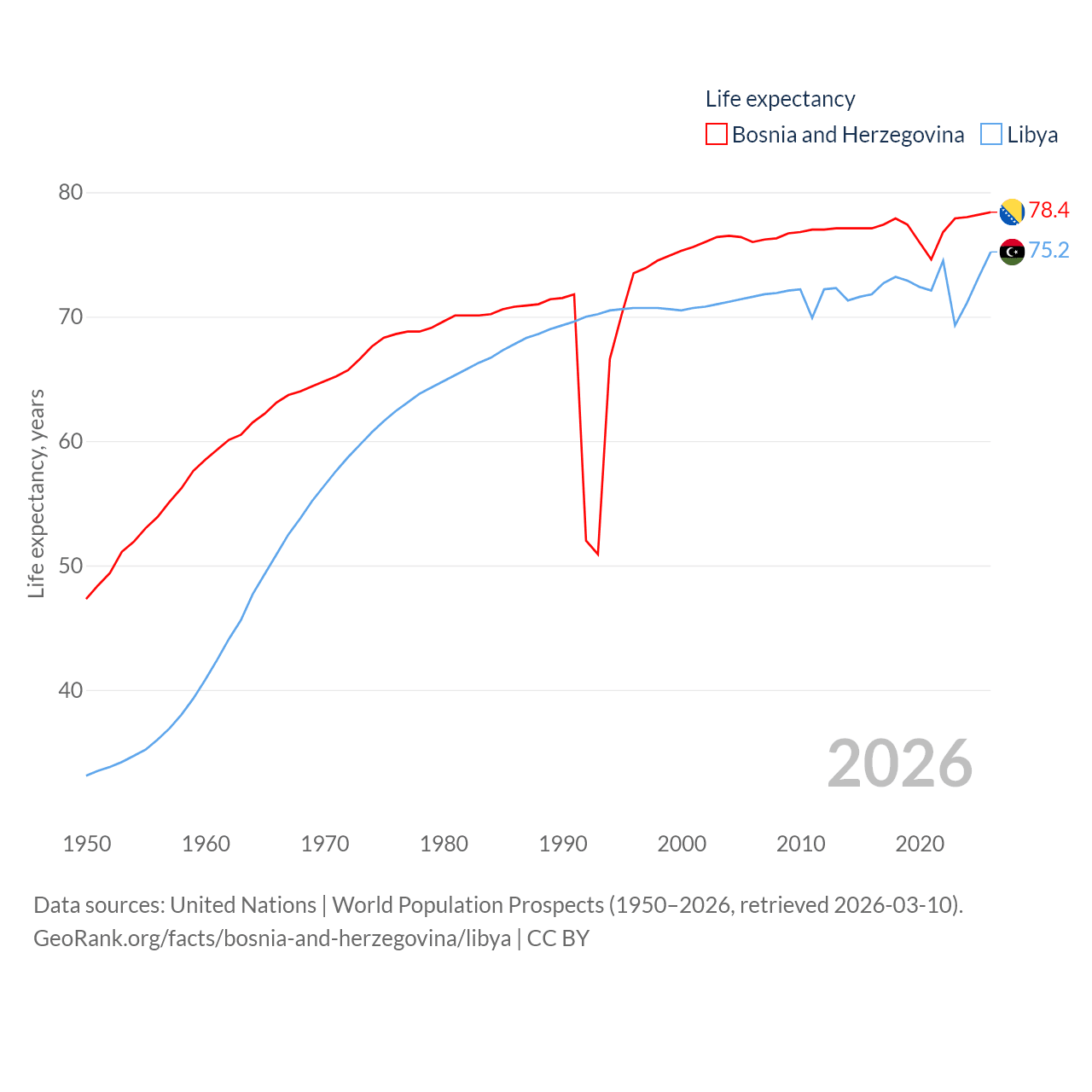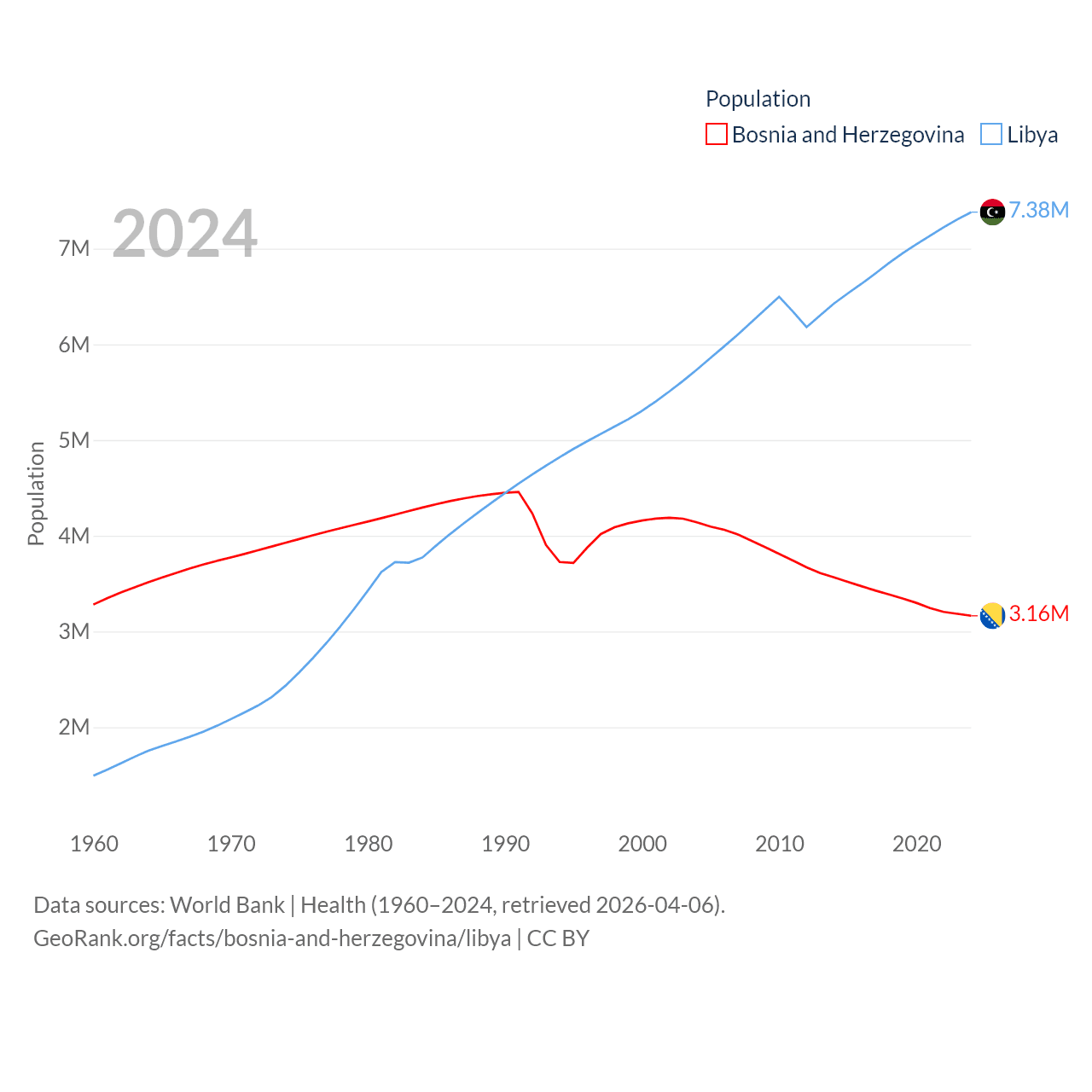 Bosnia and Herzegovina has a population of 3.16M (ranked 134/197), compared with 7.38M in Libya (ranked 105/197). Bosnia and Herzegovina's land area is 19,768 sq mi versus 679,362 sq mi for Libya (ranked 125th vs. 16th).
