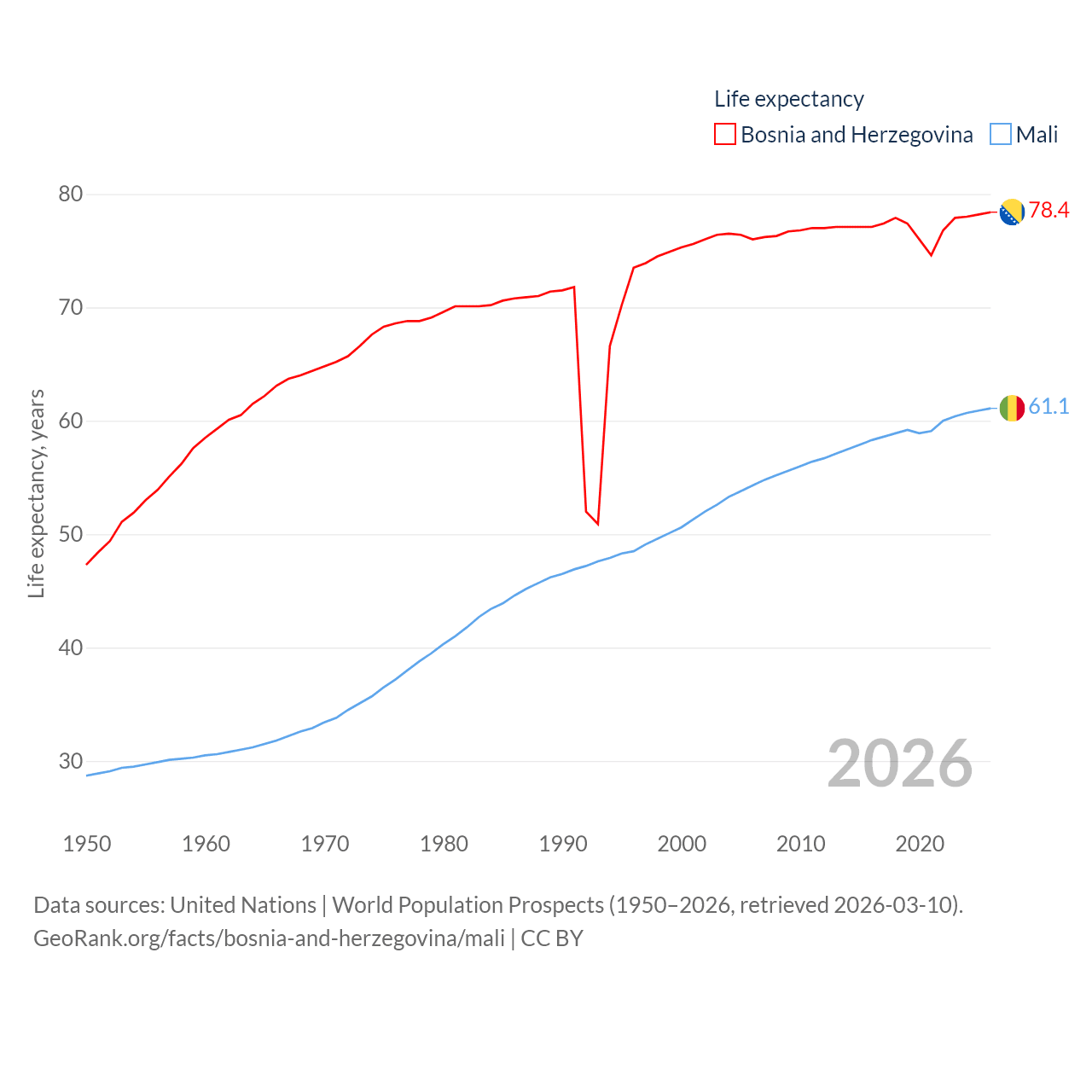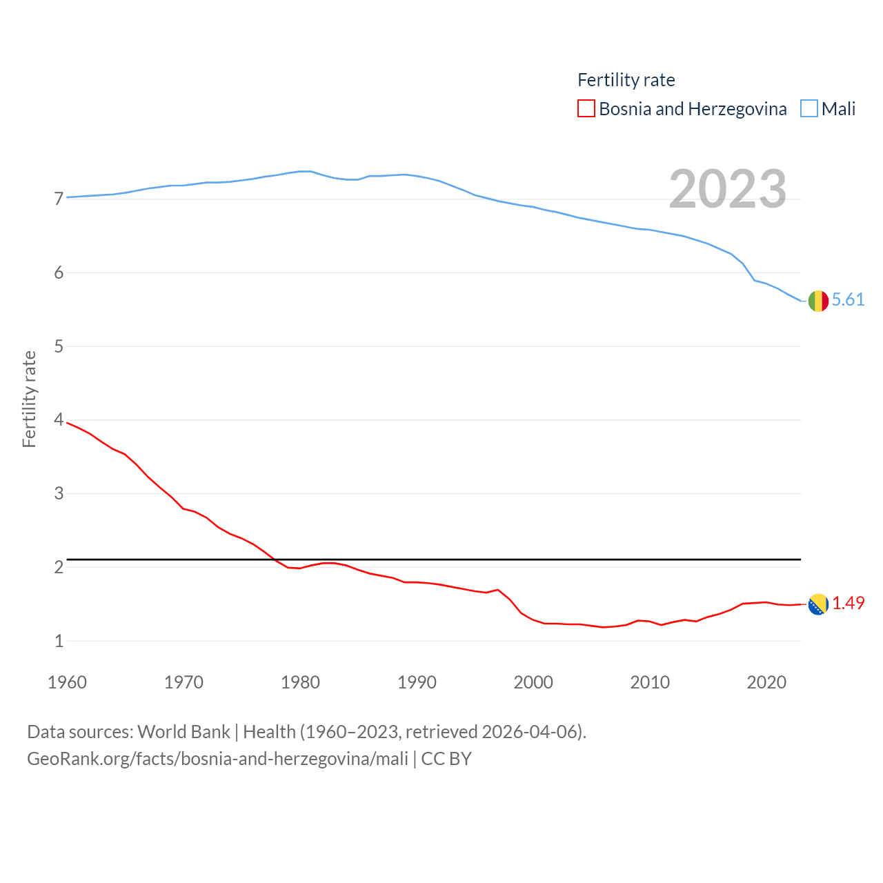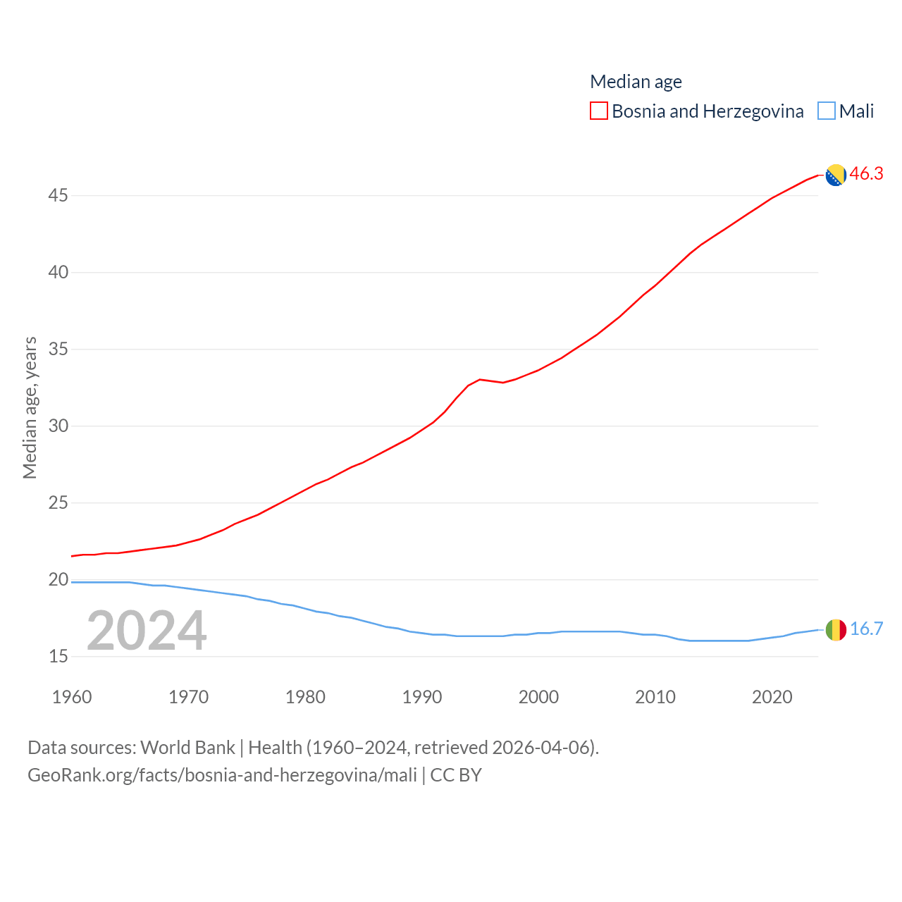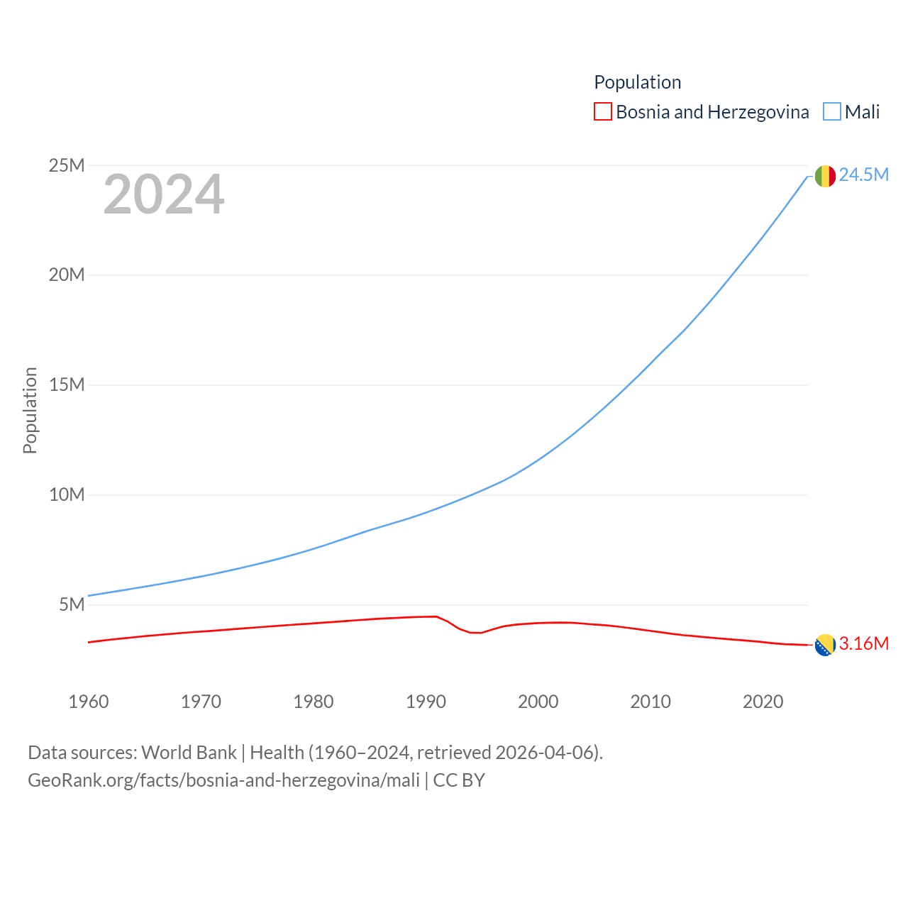 Bosnia and Herzegovina has a population of 3.16M (ranked 134/197), compared with 24.5M in Mali (ranked 58/197). Bosnia and Herzegovina's land area is 19,768 sq mi versus 471,118 sq mi for Mali (ranked 125th vs. 23rd).