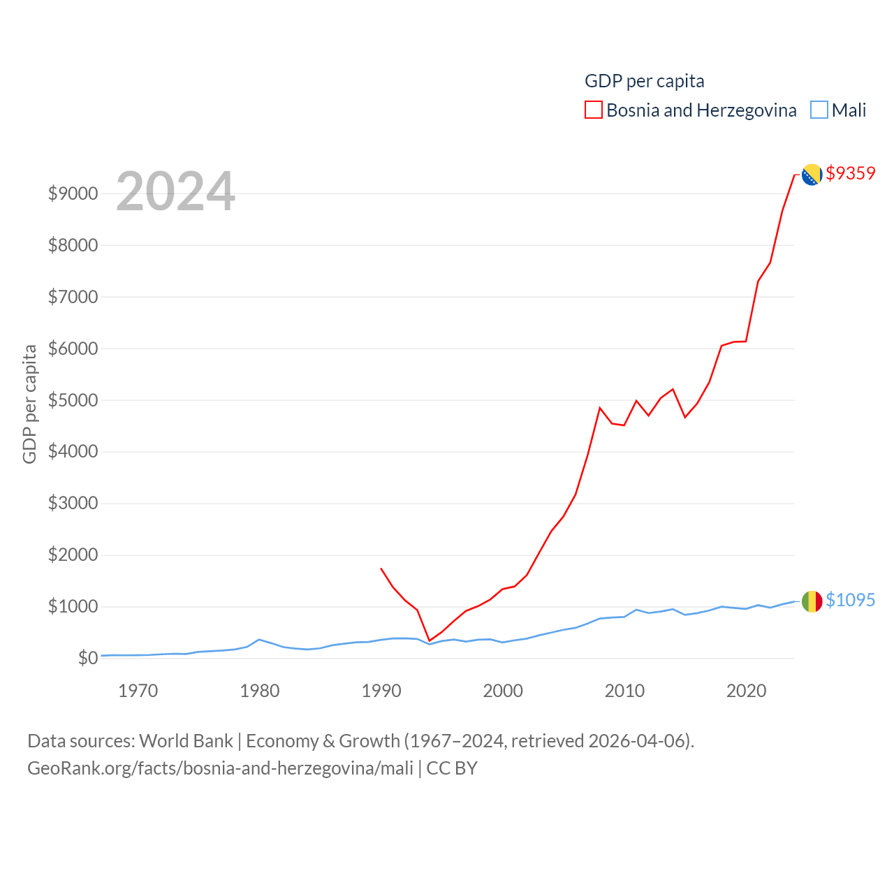 By GDP, Bosnia and Herzegovina ranks 111/197 ($29.6B) and Mali ranks 113/197 ($26.8B). By GDP per capita, Bosnia and Herzegovina ranks 87/197 ($9,359), while Mali ranks 173/197 ($1,095).