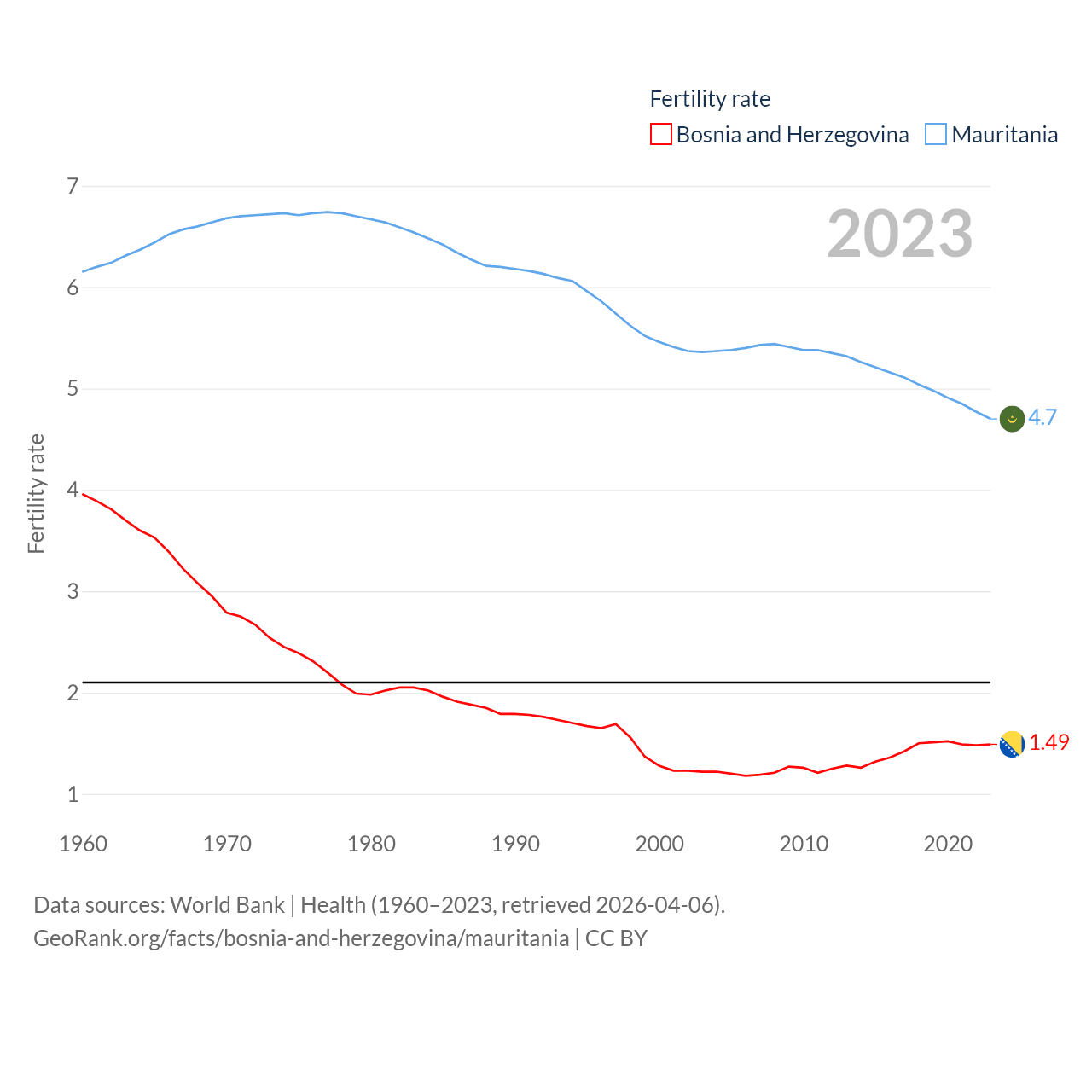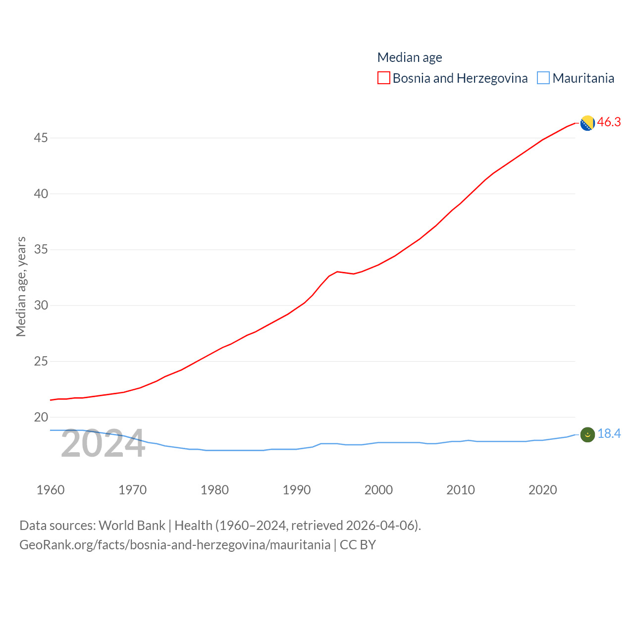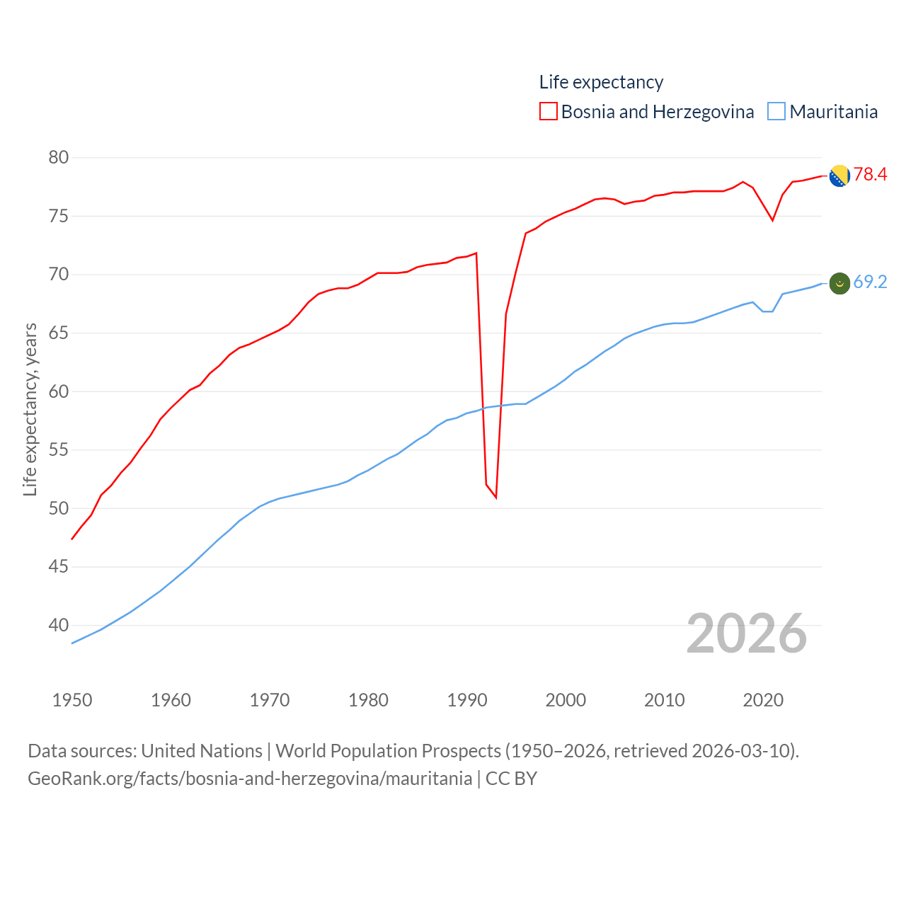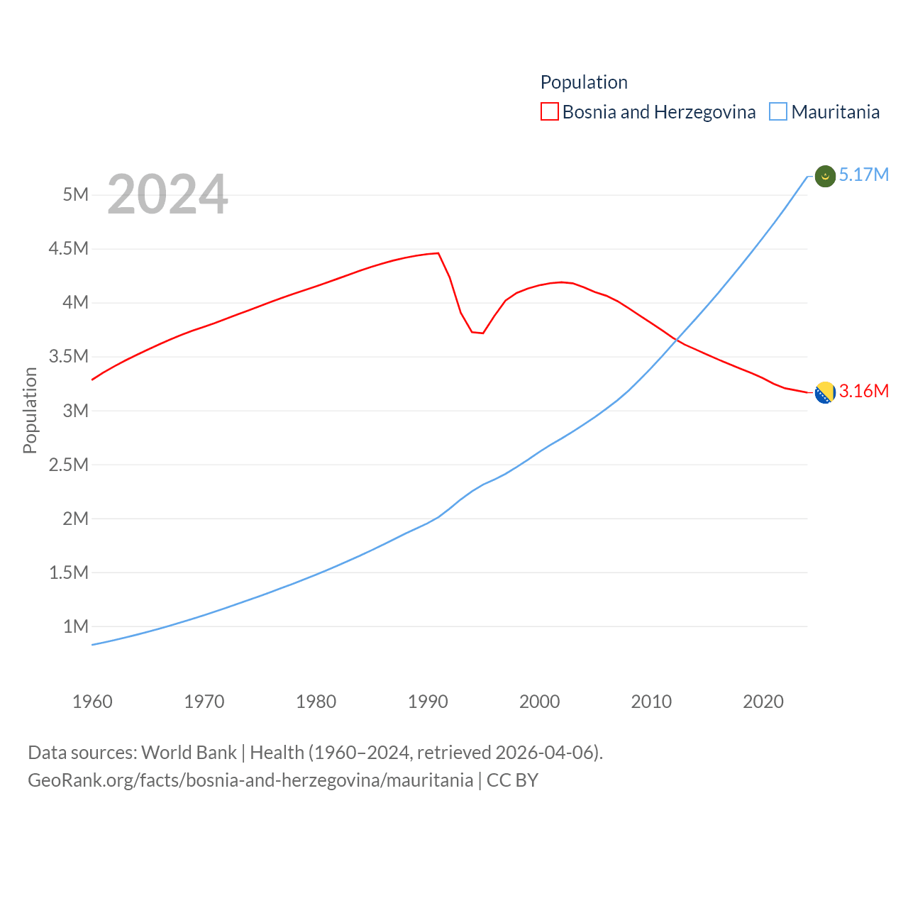 Bosnia and Herzegovina has a population of 3.16M (ranked 134/197), compared with 5.17M in Mauritania (ranked 125/197). Bosnia and Herzegovina's land area is 19,768 sq mi versus 397,955 sq mi for Mauritania (ranked 125th vs. 28th).