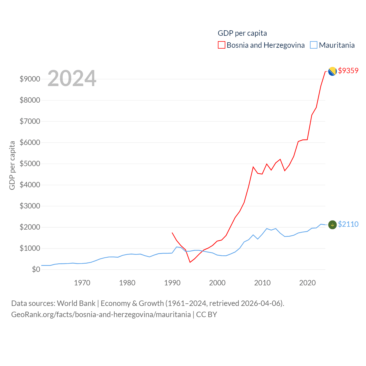 By GDP, Bosnia and Herzegovina ranks 111/197 ($29.6B) and Mauritania ranks 153/197 ($10.9B). By GDP per capita, Bosnia and Herzegovina ranks 87/197 ($9,359), while Mauritania ranks 156/197 ($2,110).