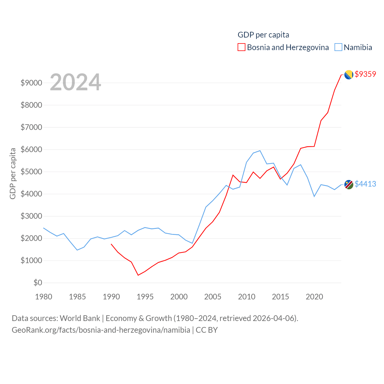 By GDP, Bosnia and Herzegovina ranks 111/197 ($29.6B) and Namibia ranks 147/197 ($13.4B). By GDP per capita, Bosnia and Herzegovina ranks 87/197 ($9,359), while Namibia ranks 126/197 ($4,413).