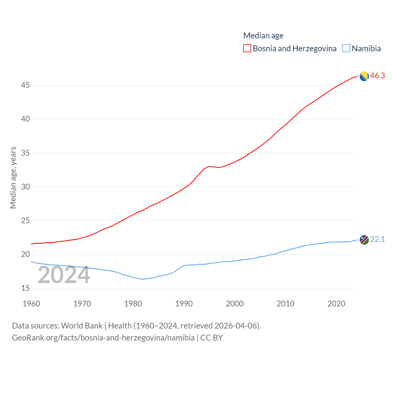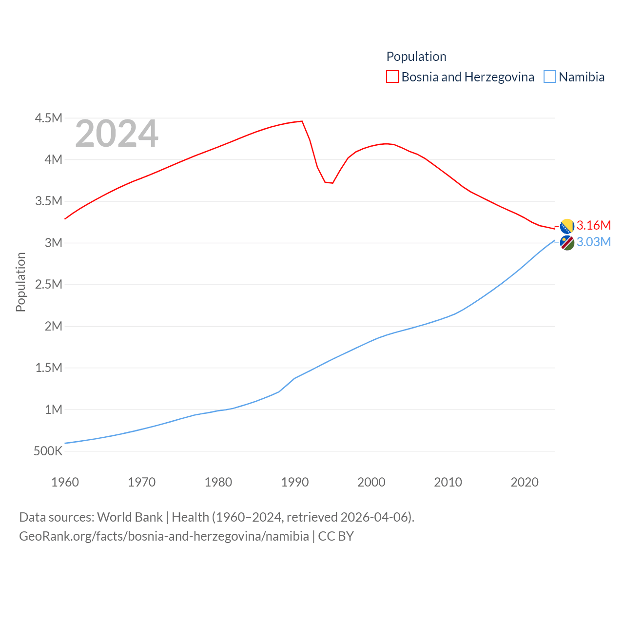 Bosnia and Herzegovina has a population of 3.16M (ranked 134/197), compared with 3.03M in Namibia (ranked 136/197). Bosnia and Herzegovina's land area is 19,768 sq mi versus 317,874 sq mi for Namibia (ranked 125th vs. 33rd).
