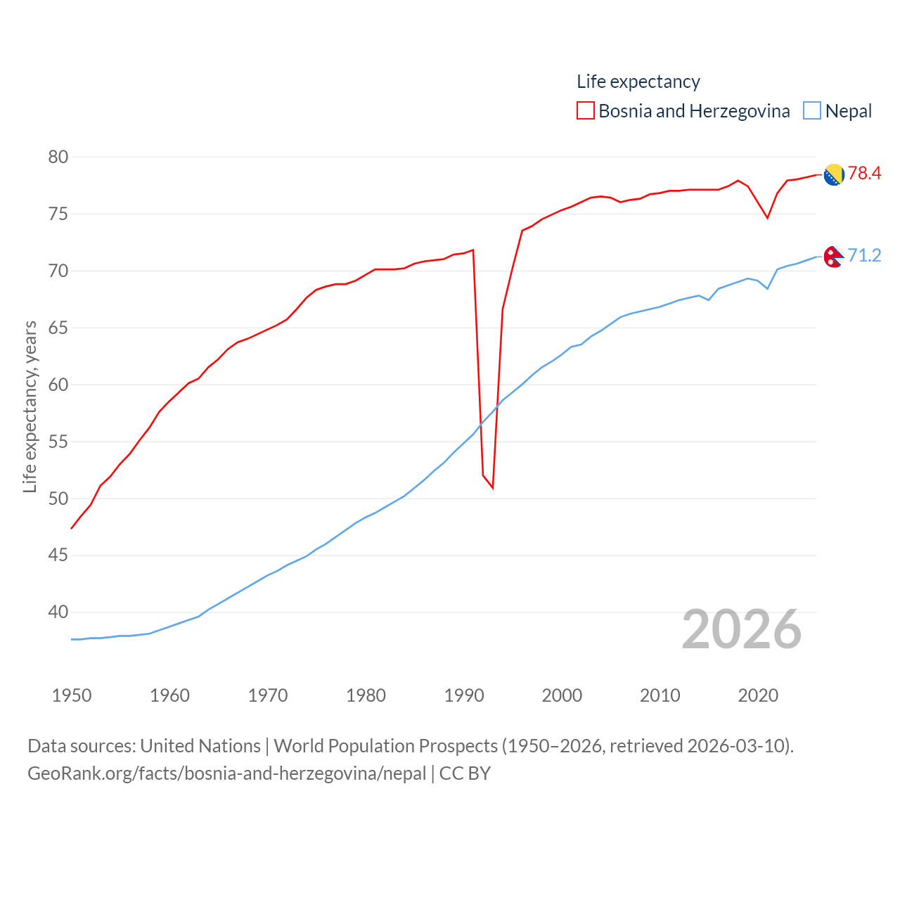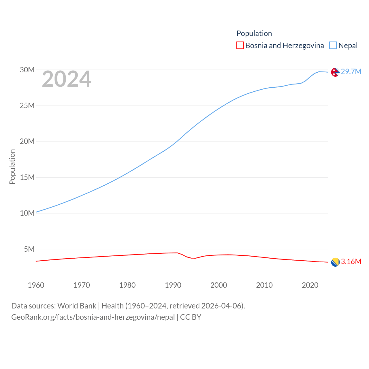 Bosnia and Herzegovina has a population of 3.16M (ranked 134/197), compared with 29.7M in Nepal (ranked 51/197). Bosnia and Herzegovina's land area is 19,768 sq mi versus 55,348 sq mi for Nepal (ranked 125th vs. 92nd).