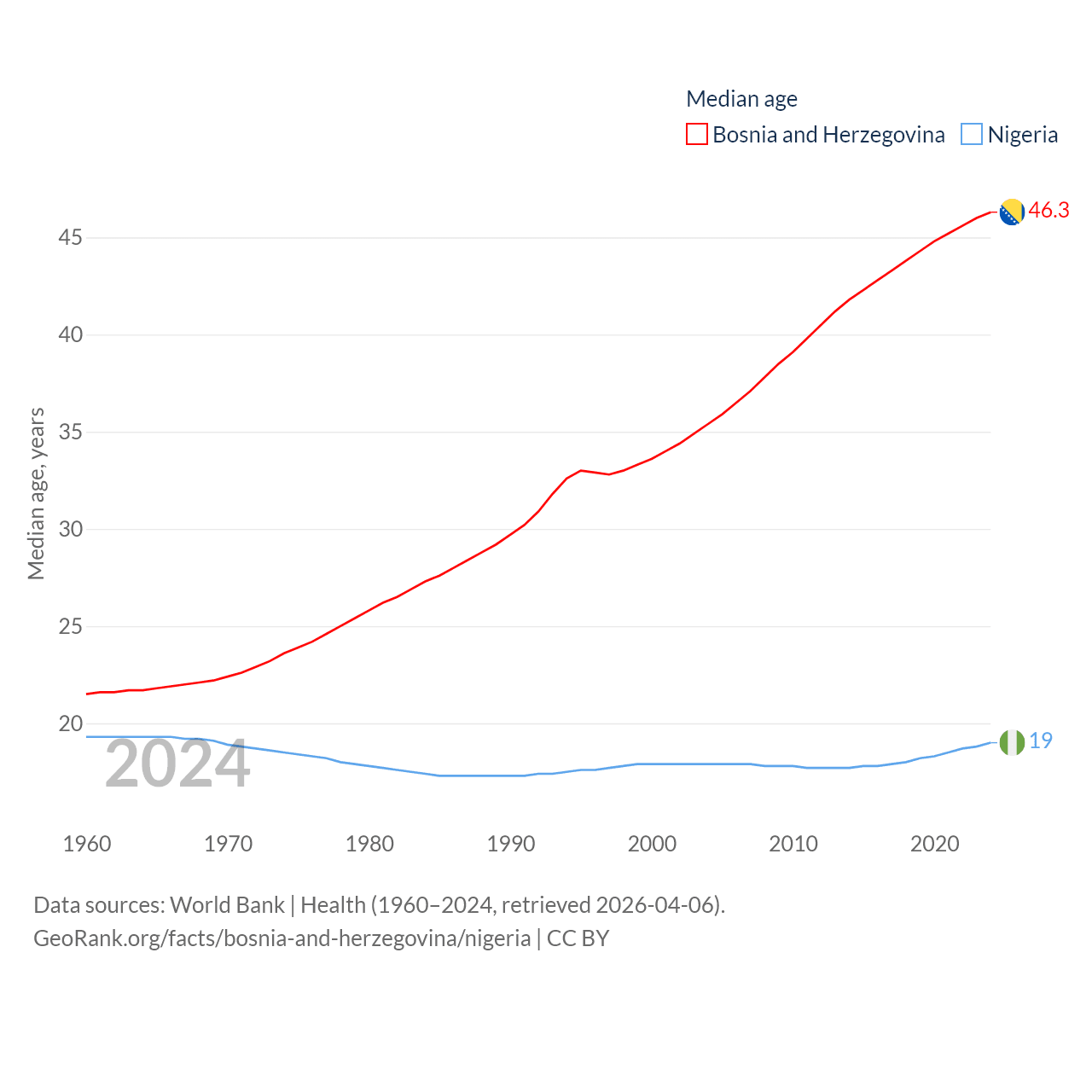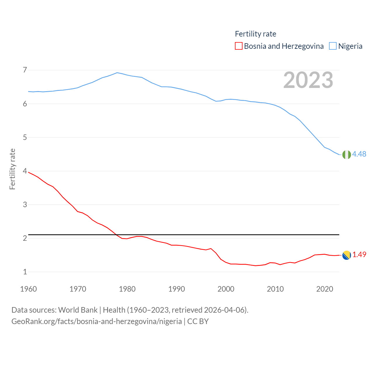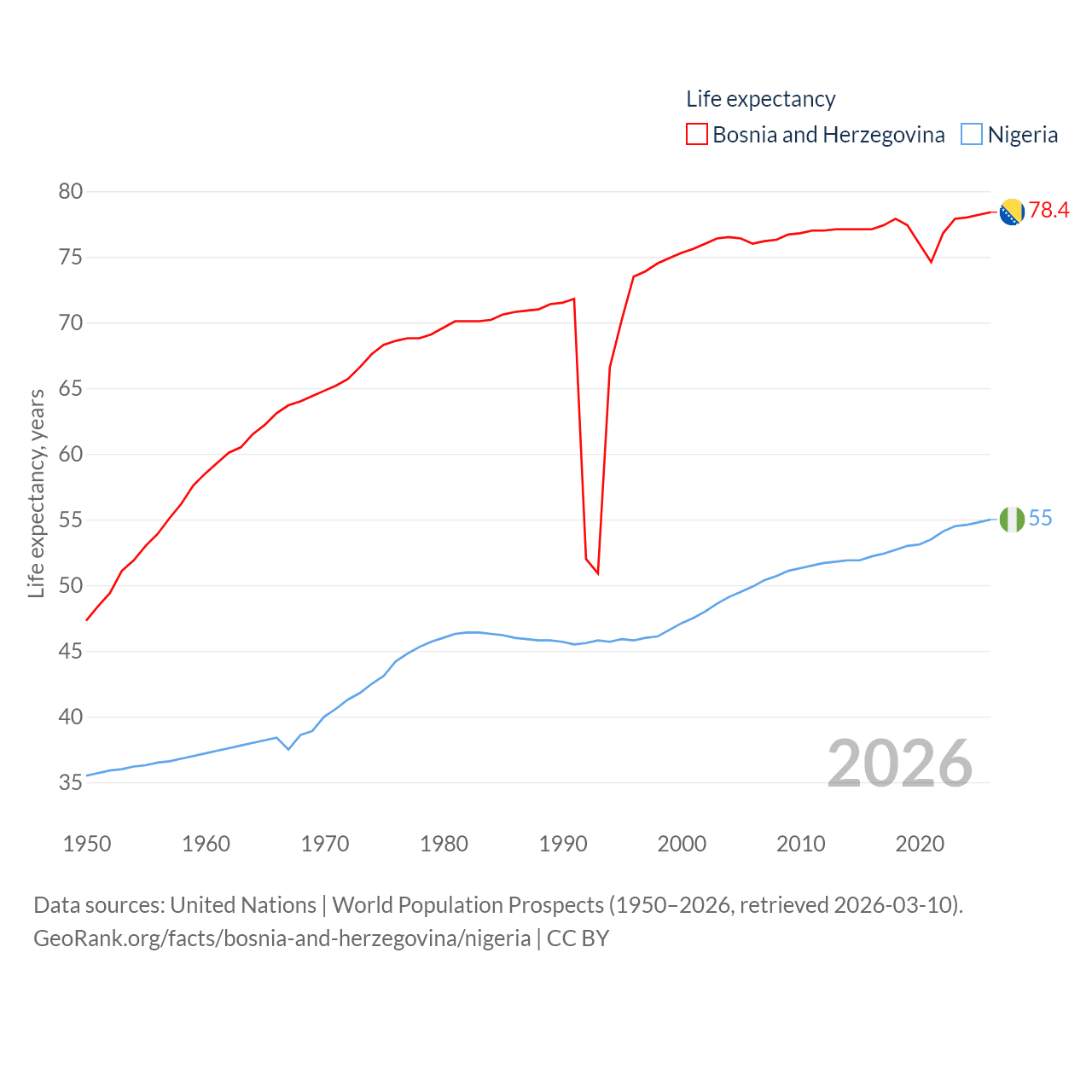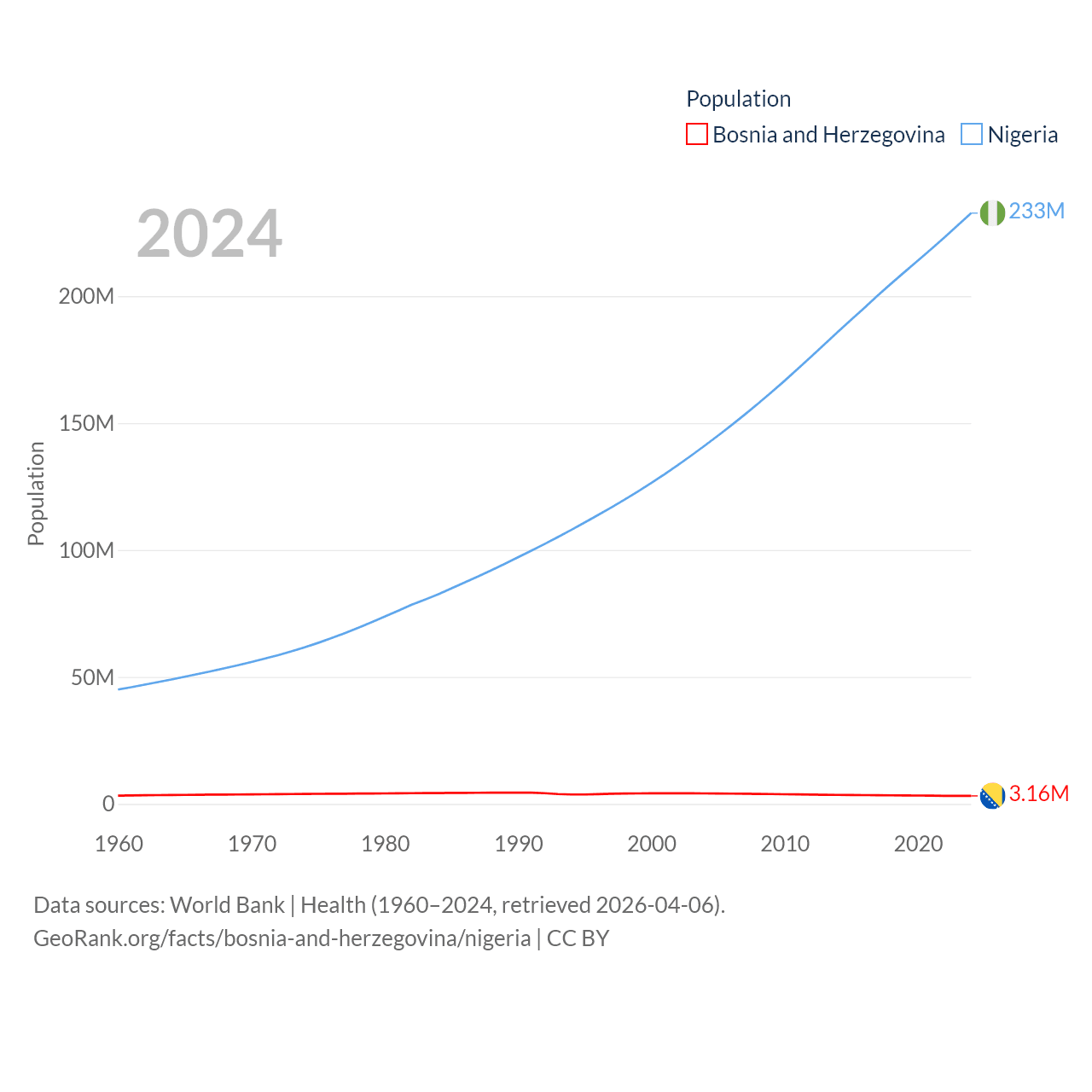 Bosnia and Herzegovina has a population of 3.16M (ranked 134/197), compared with 233M in Nigeria (ranked 6/197). Bosnia and Herzegovina's land area is 19,768 sq mi versus 351,650 sq mi for Nigeria (ranked 125th vs. 30th).