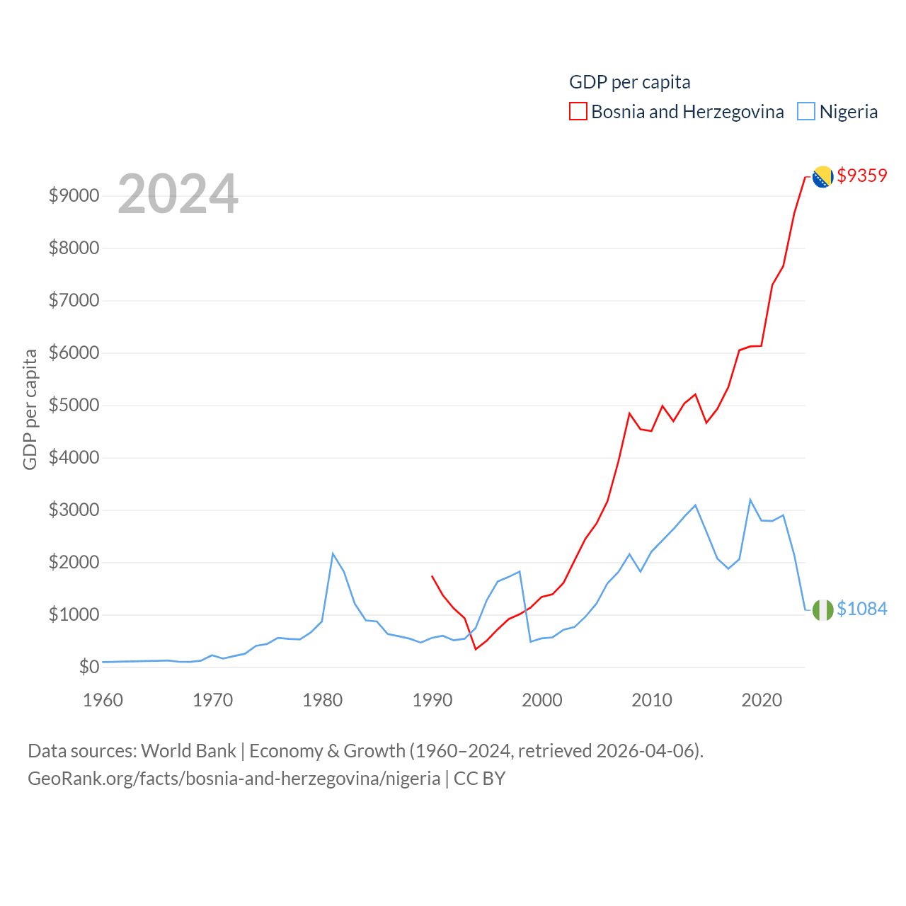 By GDP, Bosnia and Herzegovina ranks 111/197 ($29.6B) and Nigeria ranks 54/197 ($252B). By GDP per capita, Bosnia and Herzegovina ranks 87/197 ($9,359), while Nigeria ranks 174/197 ($1,084).