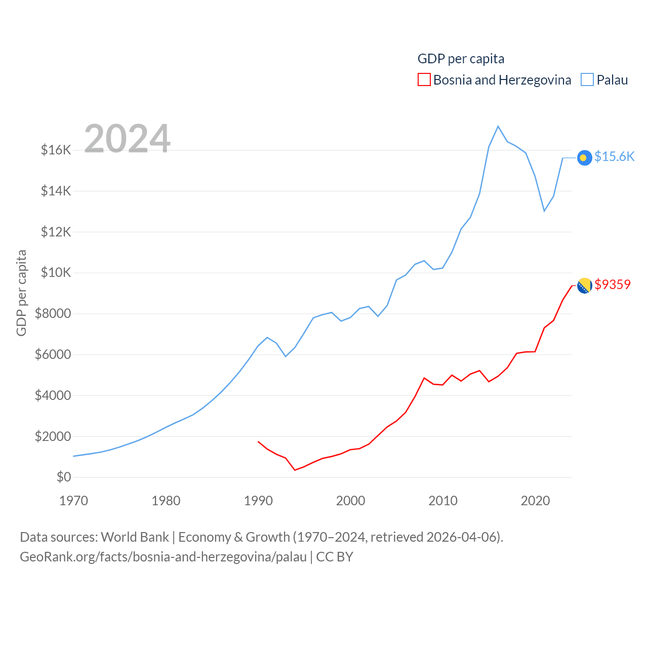 By GDP, Bosnia and Herzegovina ranks 111/197 ($29.6B) and Palau ranks 194/197 ($277M). By GDP per capita, Bosnia and Herzegovina ranks 87/197 ($9,359), while Palau ranks 67/197 ($15,611).