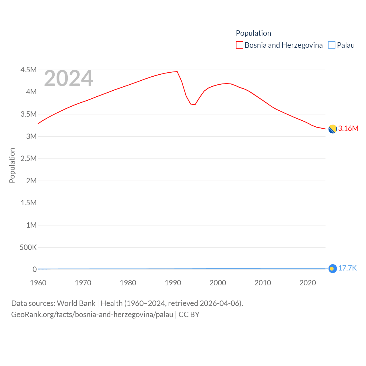 Bosnia and Herzegovina has a population of 3.16M (ranked 134/197), compared with 17.7K in Palau (ranked 194/197). Bosnia and Herzegovina's land area is 19,768 sq mi versus 177.6 sq mi for Palau (ranked 125th vs. 180th).