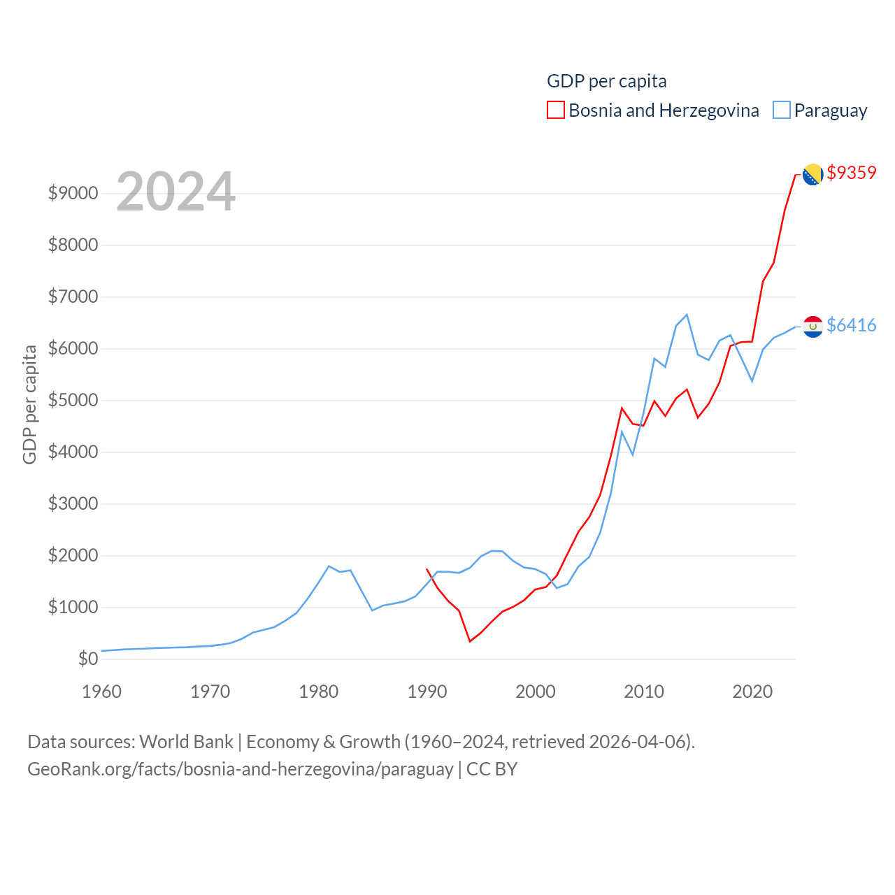 By GDP, Bosnia and Herzegovina ranks 111/197 ($29.6B) and Paraguay ranks 98/197 ($44.5B). By GDP per capita, Bosnia and Herzegovina ranks 87/197 ($9,359), while Paraguay ranks 109/197 ($6,416).