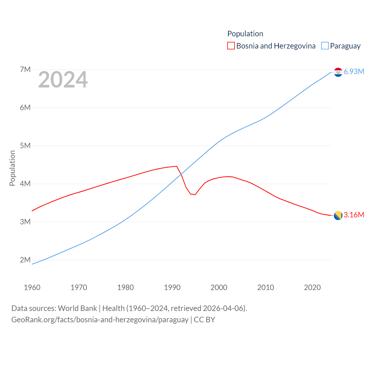 Bosnia and Herzegovina has a population of 3.16M (ranked 134/197), compared with 6.93M in Paraguay (ranked 107/197). Bosnia and Herzegovina's land area is 19,768 sq mi versus 152,901 sq mi for Paraguay (ranked 125th vs. 59th).
