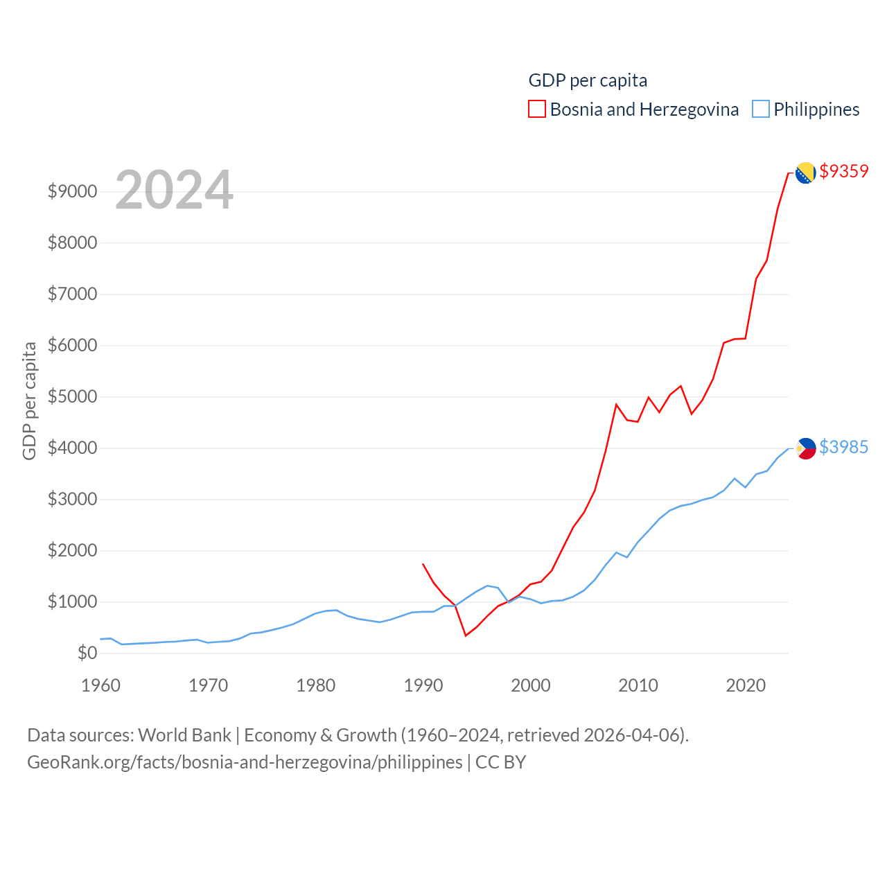 By GDP, Bosnia and Herzegovina ranks 111/197 ($29.6B) and The Philippines ranks 35/197 ($462B). By GDP per capita, Bosnia and Herzegovina ranks 87/197 ($9,359), while The Philippines ranks 130/197 ($3,985).