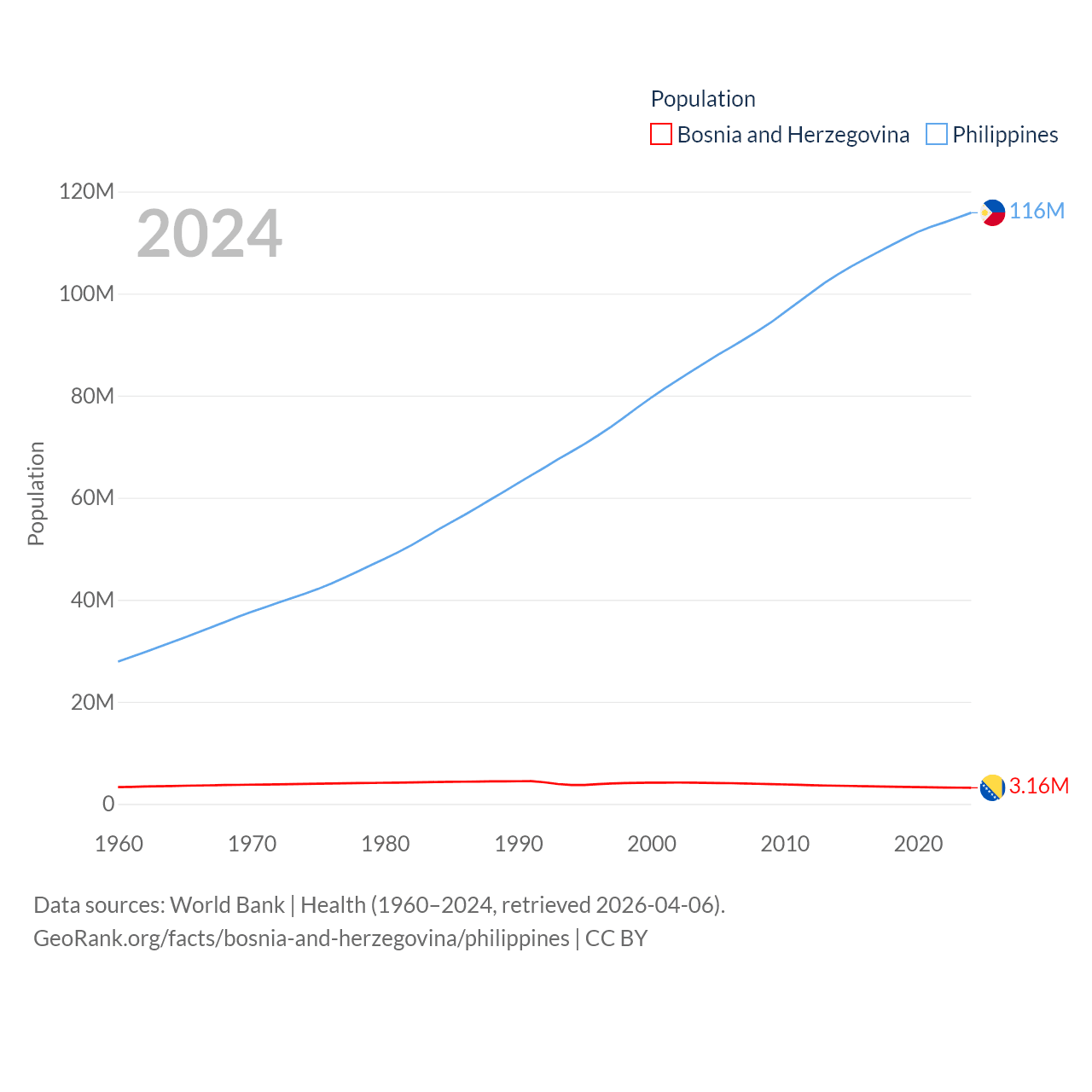 Bosnia and Herzegovina has a population of 3.16M (ranked 134/197), compared with 116M in The Philippines (ranked 14/197). Bosnia and Herzegovina's land area is 19,768 sq mi versus 115,124 sq mi for The Philippines (ranked 125th vs. 71st).